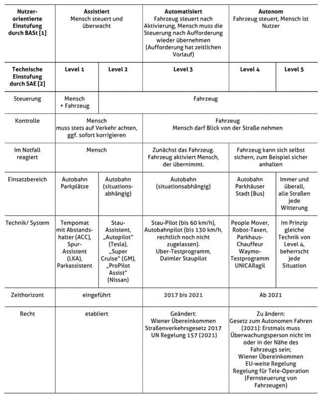 Die erste Einordnung in damals noch vier Stufen erfolgte 2012 durch die Bundesanstalt für Straßenwesen BASt. Kurze Zeit später veröffentlichte der Ingenieurverband SAE International eine erweiterte Interpretation in Form von fünf Leveln. In Forschung und Entwicklung haben sich diese fünf Level durchgesetzt, auch wenn manche Fachleute auf Überschneidungen der einzelnen Stufen hinweisen. Diese können im Dialog mit der Öffentlichkeit unklar sein. Die BASt hat daher eine vereinfachte „Nutzerkommunikation“ entworfen, die drei verschiedene Fahrerrollen definiert, damit dem Nutzenden klar ist, welche Aufgabe er im Fahrzeug hat.