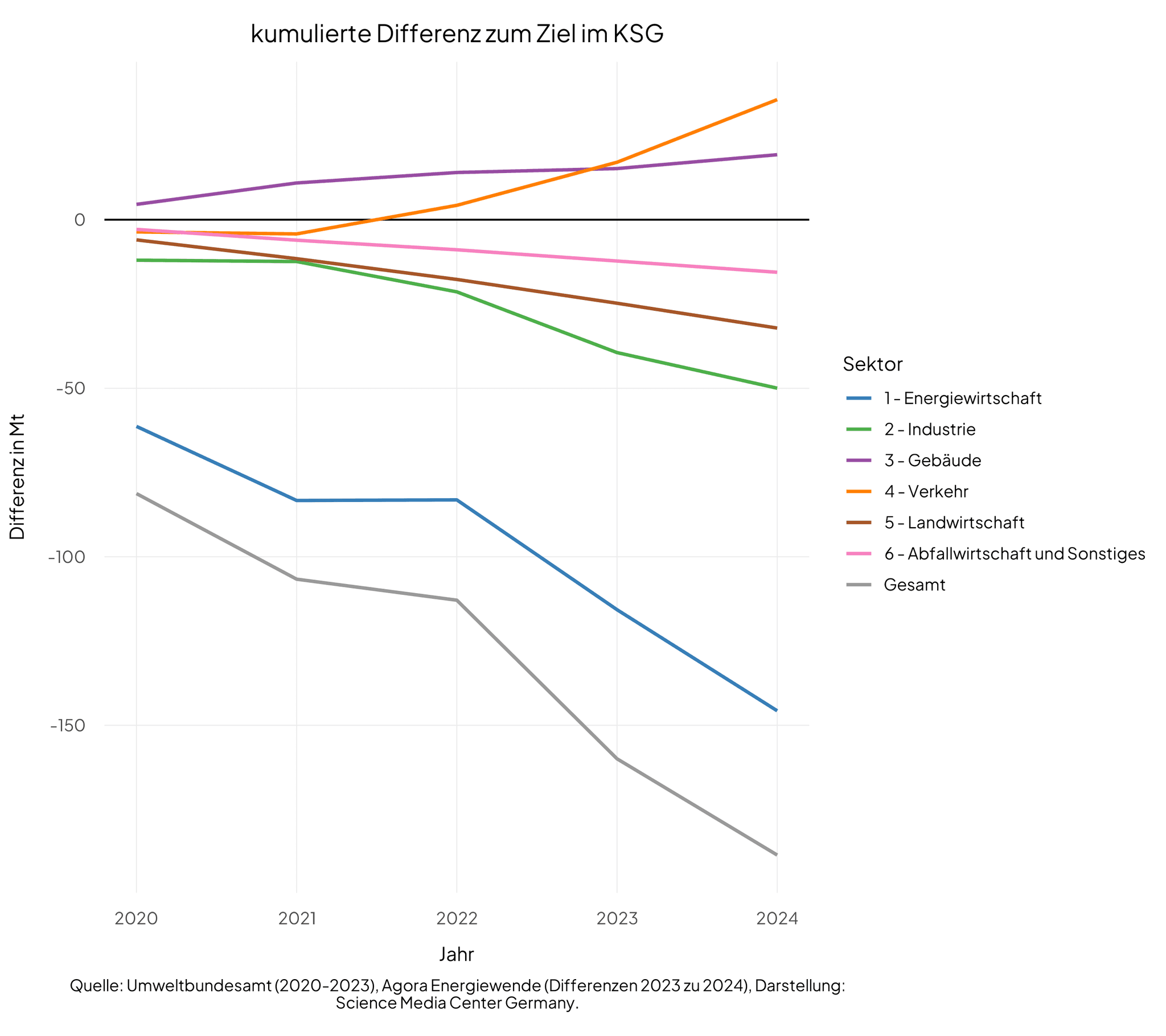 „Die Minderung der Treibhausgasemissionen im Jahr 2024 entfällt nahezu vollständig auf den massiven Rückgang in der Stromwirtschaft. In allen anderen Bereichen sind die Emissionen entweder leicht gestiegen (Industrie), nur sehr geringfügig gesunken (Verkehrssektor) oder unter Berücksichtigung der meteorologischen Bedingungen nahezu unverändert geblieben (Gebäude).“