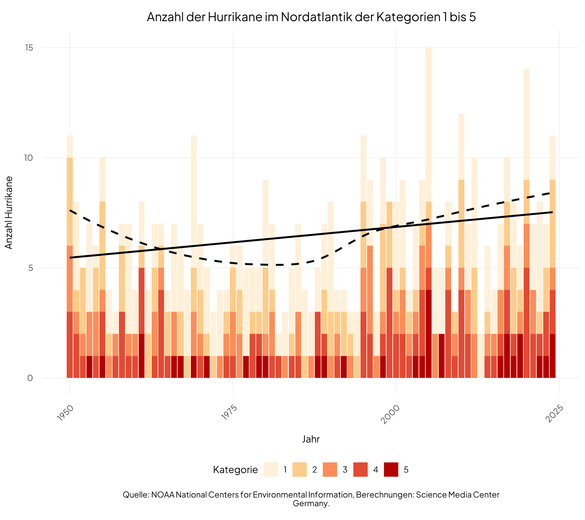 Die folgende Abbildung illustriert die Anzahl der Major Hurrikane im Nordatlantik von 1950 bis 2024. Die durchgezogene Linie zeigt jeweils den Trend über den gesamten betrachteten Zeitraum. Die gestrichelte Linie bildet die zeitlich geglätteten Daten ab, bei denen Jahre höher gewichtet werden, je näher sie am jeweils betrachteten Ereignisjahr liegen.