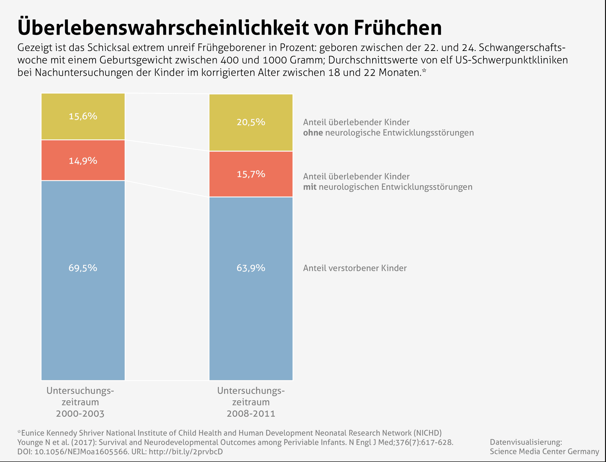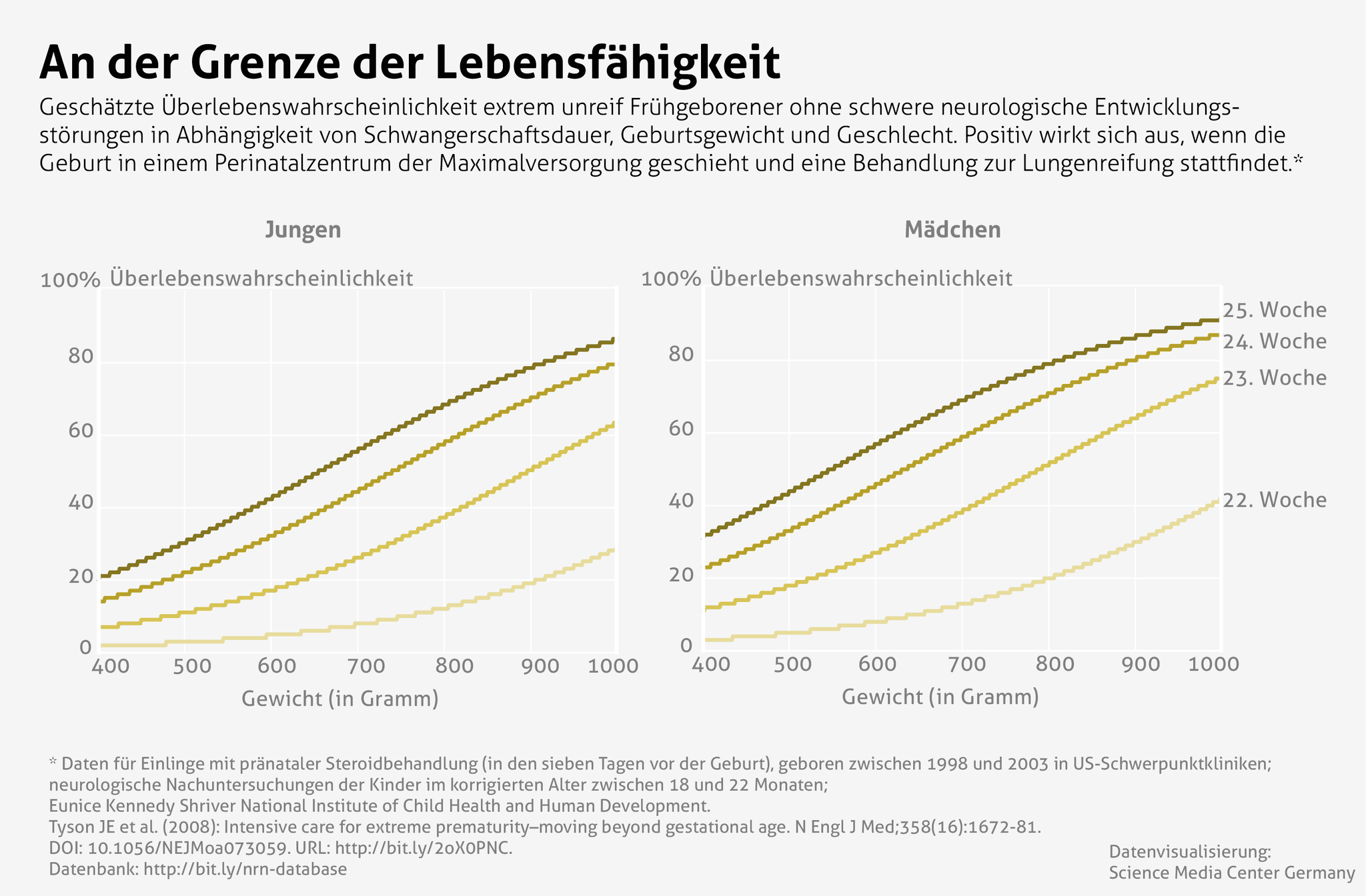 [5] NICHD Neonatal Research Network (NRN): Extremely Preterm Birth Outcome Data. (Kalkulator für Überlebenswahrscheinlichkeit und Schweregrad von Entwicklungsstörungen bei Frühchen, basierend auf Stoll BJ et al. (2015) und Tyson JE et al. (2008); Datengrundlage der SMC-Datenvisualisierungen; Anm. d. Red.)
