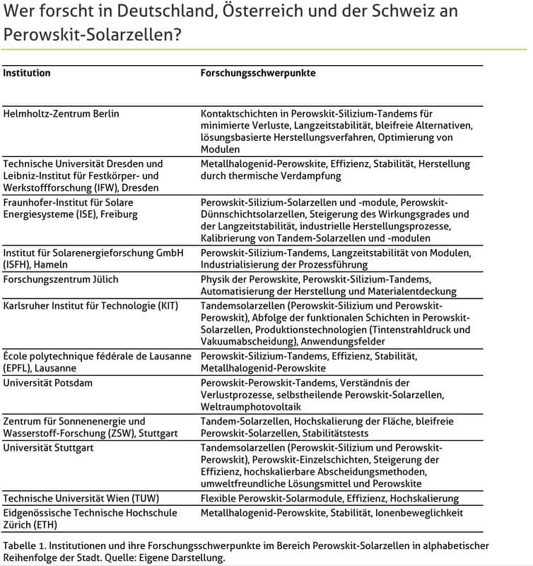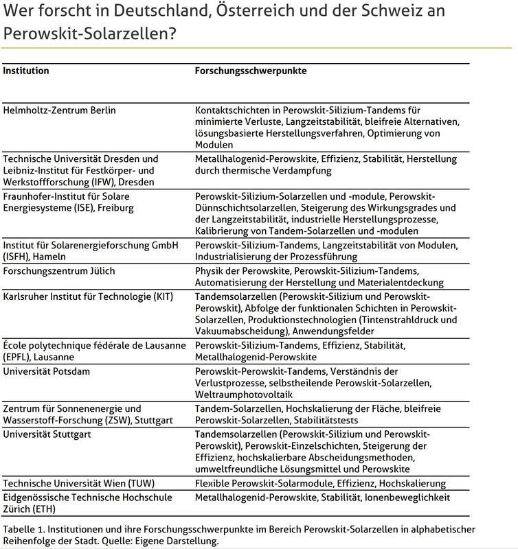 Dieses Fact Sheet benennt die Vor- und Nachteile der Perowskit-Solarzellen, ordnet den Stand der Forschung ein und listet am Ende wichtige Forschungsgruppen im deutschsprachigen Raum mit ihren Schwerpunkten auf.