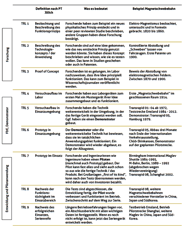 Die folgende Tabelle listet die TRL, die Definition für die Forschungsförderung nach Projektträger Jülich sowie eine kurze Erklärung und als Beispiel die Entwicklung der Magnetschwebebahn. Ganz links die Zuordnung der TRL zu den klassischen Begriffen Forschung und Entwicklung.