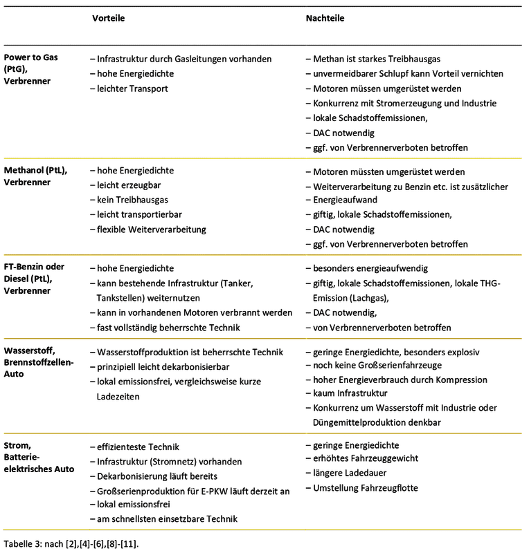 Die folgende Tabelle verdeutlicht, welche Techniken als Ersatz für klassische Verbrennungsmotoren derzeit diskutiert werden, und wie viele Produktionsschritte notwendig sind, bis ein Auto mit dem Treibstoff losfahren kann. Zum Vergleich haben wir die Angaben für Brennstoffzellen- und Batterieautos ergänzt.