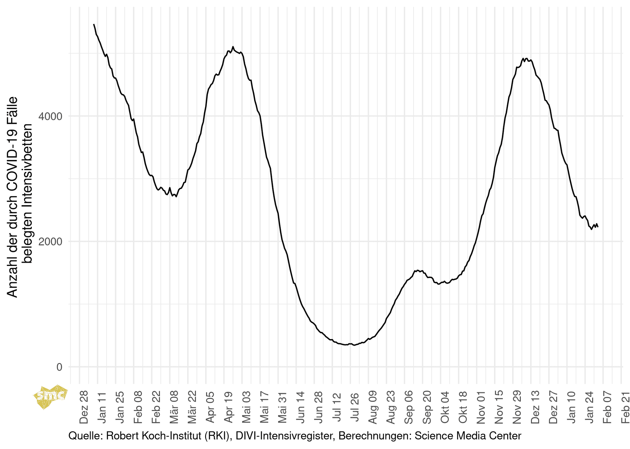 Der Rückgang der Zahl der mit COVID-19-Fällen belegten Betten auf den Intensivstationen hat sich weiter verlangsamt und kann in den kommenden Tagen zu einem erneuten Anstieg umschwenken.