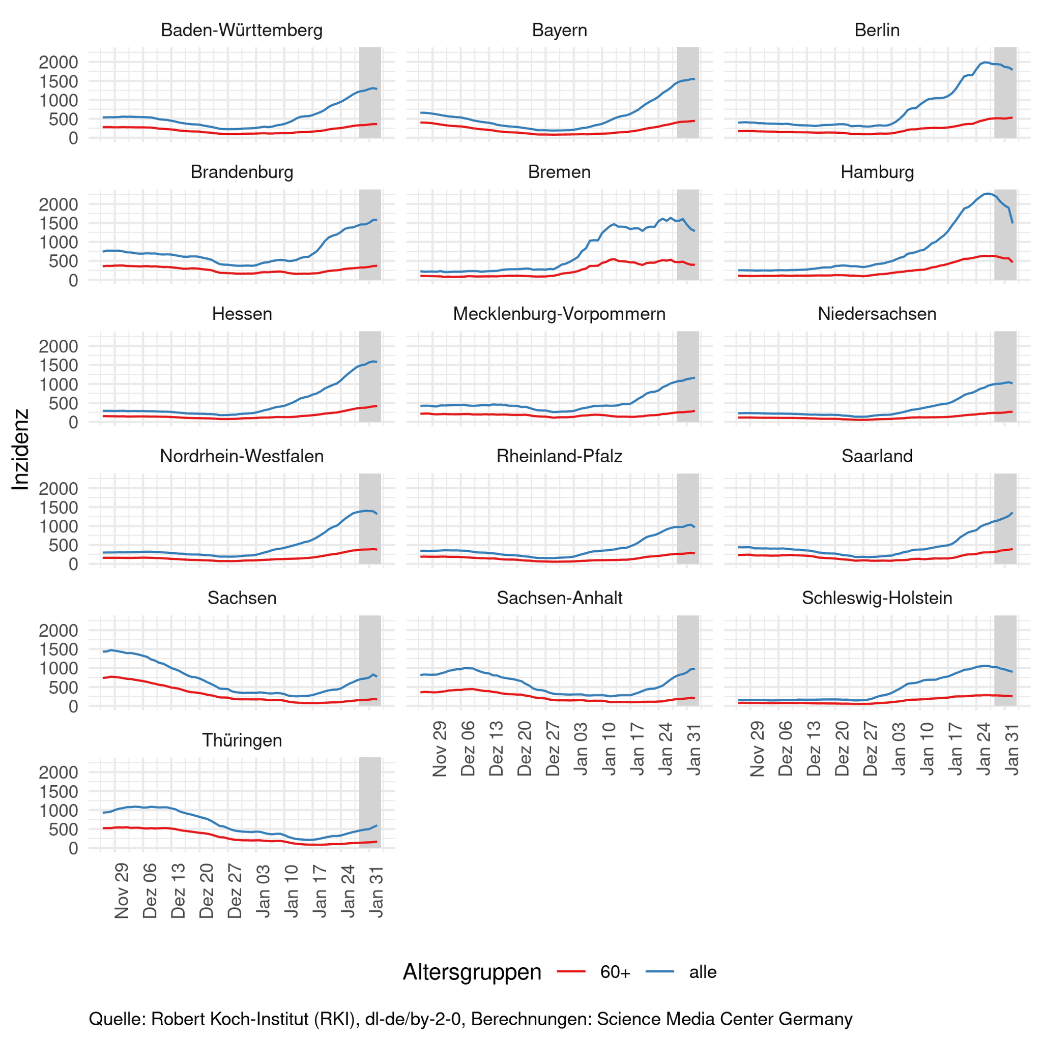Im Folgenden wird das Wachstum der Inzidenz vom 29.01.2022 im Vergleich zur Vorwoche betrachtet. In Hamburg, Schleswig-Holstein und Berlin zeichnet sich eine Trendwende ab. Ob diese auch einen wirklichen Rückgang der Fallzahlen in der Bevölkerung bedeutet oder auf die Meldekette zurückzuführen sind, werden erst die nächsten Tage zeigen. Zeitlich würde ein echter Rückgang aber zu Beobachtungen aus anderen Weltregionen passen.