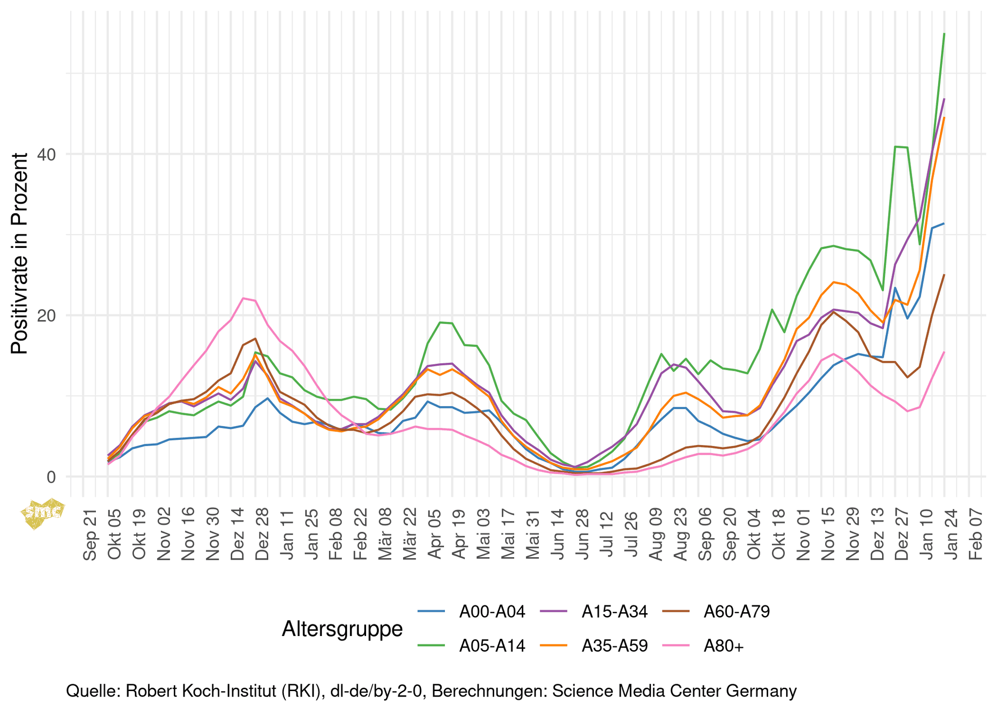 Dass aber auch der tatsächliche Scheitel der aktuellen Omikron-Welle kurz bevorstehen muss, lässt sich über ein kleines Gedankenexperiment nachvollziehen. Geht man von einer moderaten Dunkelziffer aus, haben sich in den vergangenen drei Monaten rund 20 Prozent der 5- bis 14-Jährigen Infiziert. Allein in der vergangenen Woche waren es über 3 Prozent. Setzt man in dieser Woche ein Wachstum von 60 Prozent an, so wie es in den vergangenen Wochen im Bevölkerungsschnitt beobachtet wurde, würden in dieser Woche etwa 5 Prozentpunkte zum Anteil der in diesem Winter infizierten Kinder hinzukommen. Selbst wenn man diesen Anteil von 5 Prozent für die kommenden Wochen beibehält und nicht weiter wachsen lässt, wären wir bis Mitte Februar bei 30 bis 35 Prozent Infizierter im aktuellen Winter. Bei einer symmetrischen Welle hätten bis zum Peak exakt die Hälfte der Infektionen stattgefunden. Erfahrungsgemäß sind die Wellen in dieser Pandemie nicht ganz symmetrisch, sodass sich nach einem Peak sogar mehr Menschen infizieren als vorher. Mit den oben genannten Werten würde ein Peak Mitte Februar für die Altersgruppe der 5- bis 14-Jährigen bedeuten, dass über 60 bis 70 Prozent in diesem Winter eine Infektion durchmachen werden. Eine höhere Dunkelziffer, weiterer Infektionsschutz durch vorherige Infektionen oder Impfungen und ein Inzidenzwachstum über diese Woche hinaus, wie er ja eigentlich eintreten müsste, wenn der Peak noch nicht erreicht ist, erhöhen diese Anteile weiter. Diese Überlegungen lassen vermuten, dass der Peak der Welle für die 5- bis 14-Jährigen in den nächsten Tagen zu erwarten ist. Der Rückgang im Wachstum der Meldeinzidenzen kann also nur zum Teil auf die geänderte Teststrategie zurückgeführt werden. Wachstumsraten von über 50 Prozent pro Woche sind jetzt schon eher unwahrscheinlich. Der Anteil der Erwachsenen, die laut Meldeinzidenz in diesem Winter bereits infiziert waren, liegt zwar niedriger, hier muss aber aufgrund der fehlenden Reihentestungen von einer höheren Dunkelziffer ausgegangen werden. Auch ist von einem höheren Infektionsschutz durch die Impfung zu auszugehen, da viele Booster-Impfungen erst in den vergangenen Wochen durchgeführt wurden. Bei den 5- bis 11-Jährigen liegt die Erstimpfquote hingegen gerade einmal bei 18,3 Prozent, hier ist also von einem kleineren Effekt auszugehen.