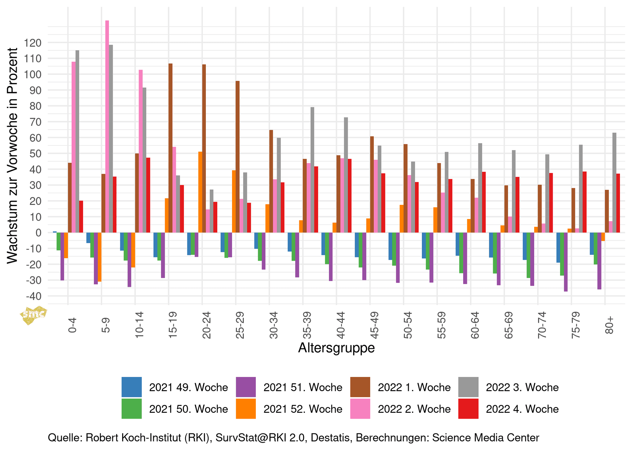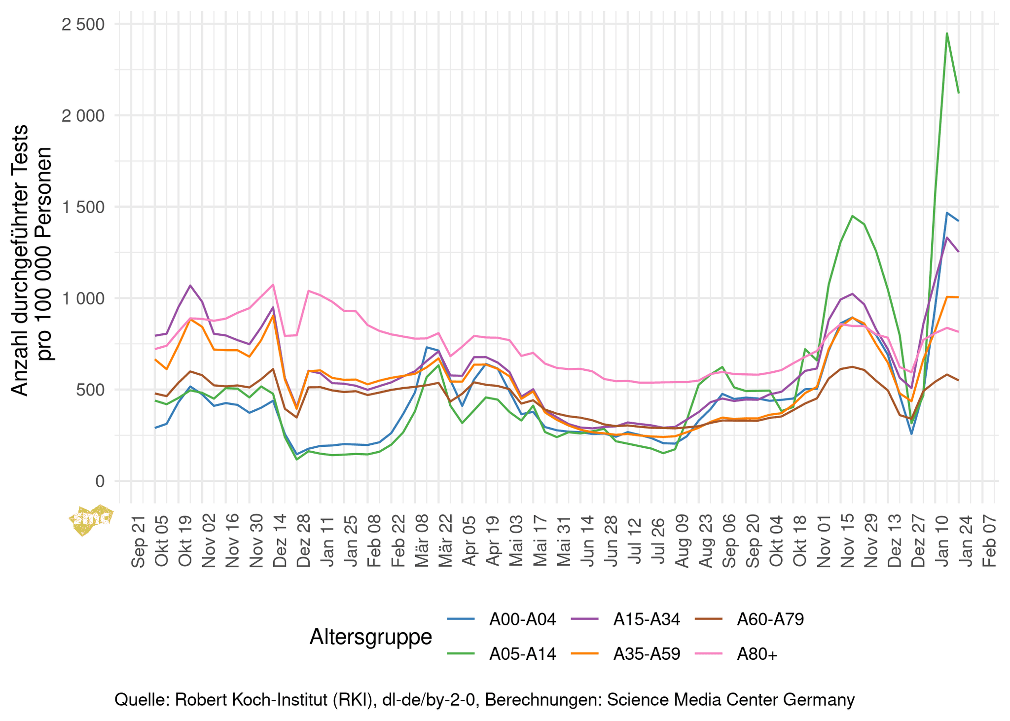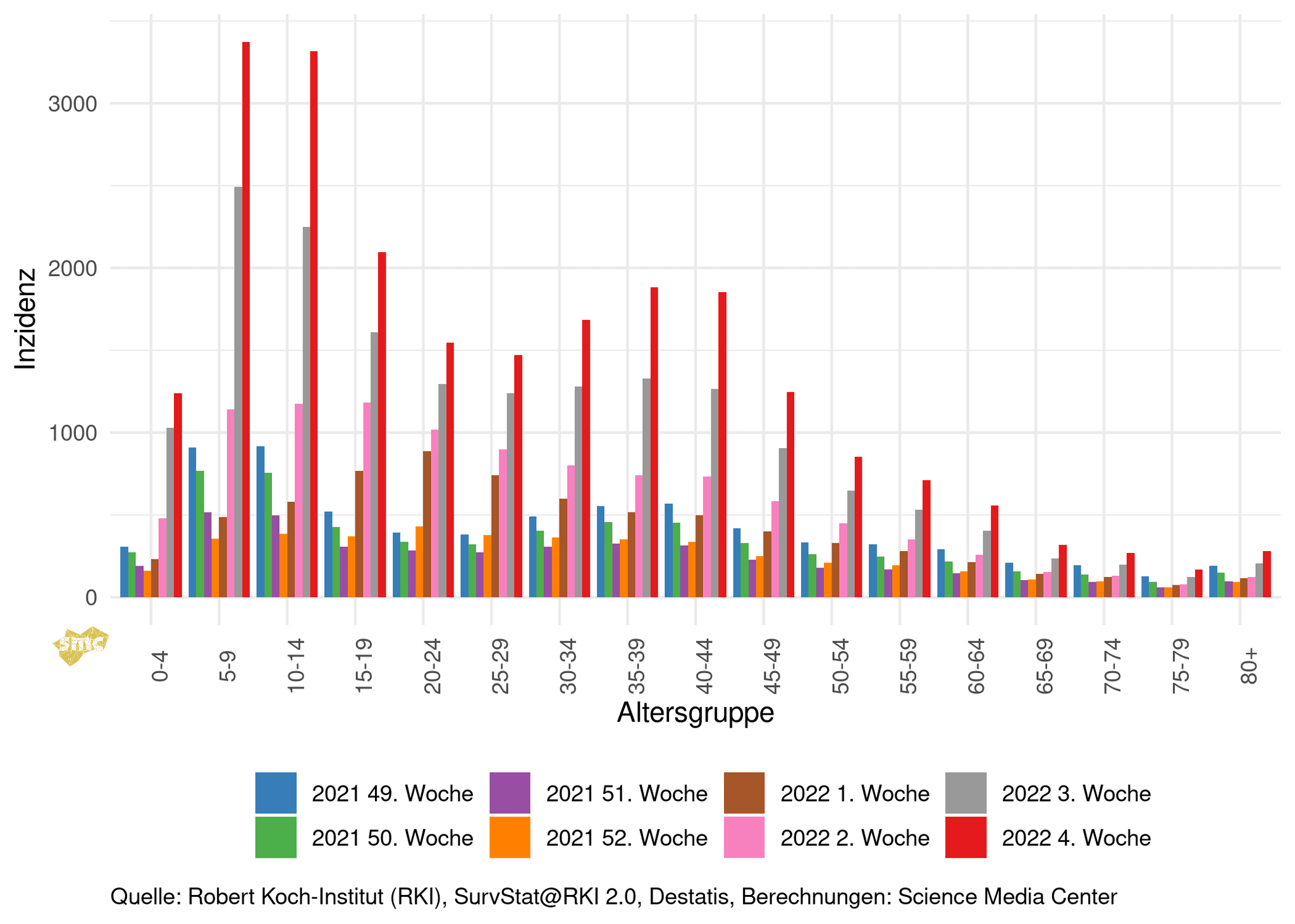 Bei den 5- bis 14-Jährigen liegt die Meldeinzidenz der vergangenen Woche deutlich oberhalb von 3000. Das Erreichen des Peaks ist in diesen Altersgruppen kurzfristig zu erwarten.