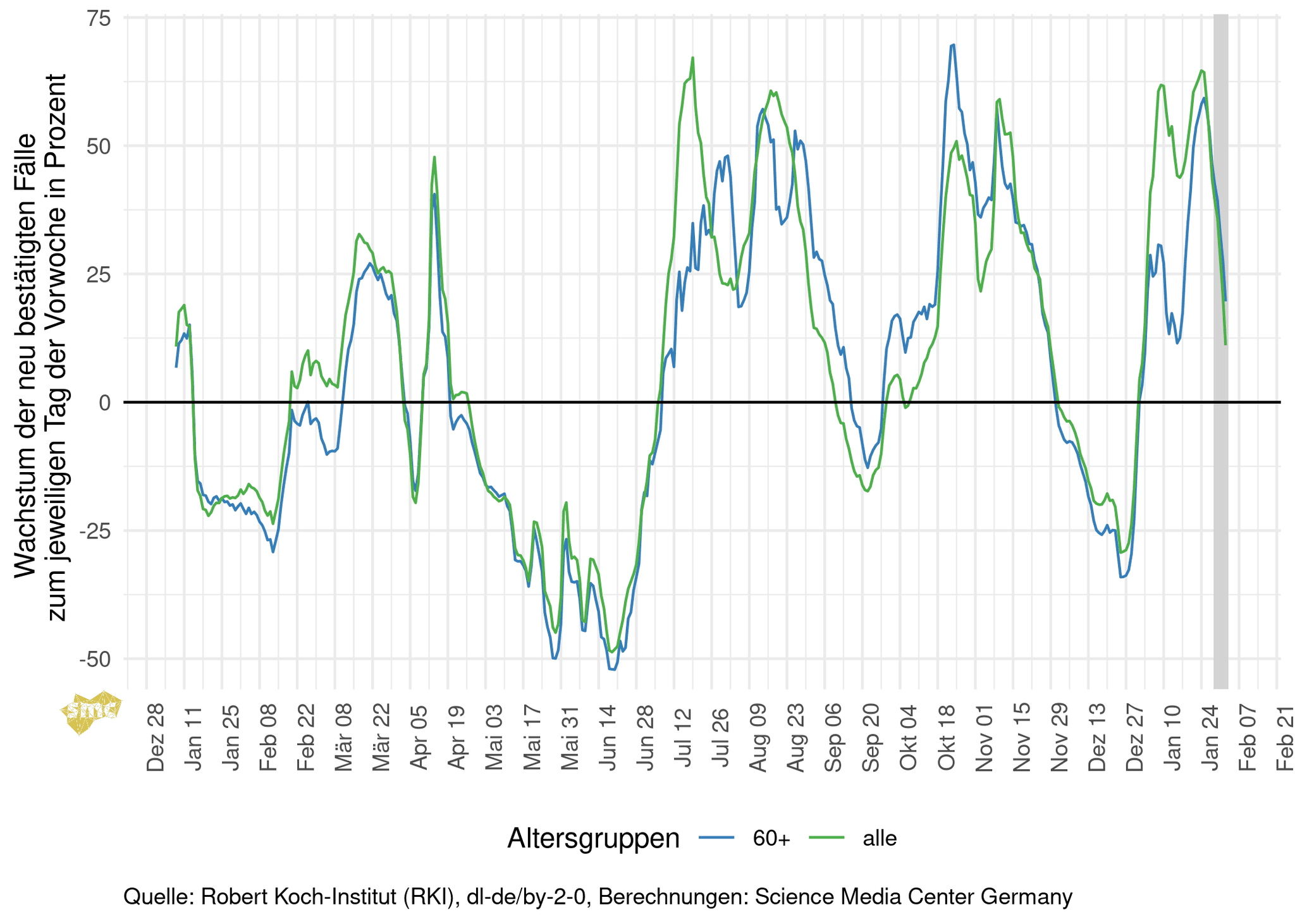 Die Grafik zeigt für jeden Tag das prozentuale Wachstum der geglätteten Fallzahlen im Vergleich zur Vorwoche. Dabei werden einmal alle gemeldeten Fälle berücksichtigt und einmal nur Fälle mit einem Alter von mindestens 60 Jahren. Das Wachstum sinkt, was aber auch mit den Kapazitätsgrenzen und der Teststrategie zusammenhängt.