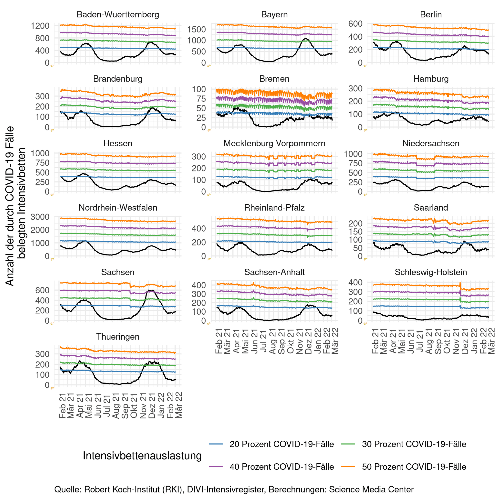 Schaut man sich nach Bundesländern an, wie die Intensivstationen ausgelastet sind, lag im vergangenen Winter das jeweilige Maximum auf einem anderen relativen Niveau. Während Berlin und Sachsen in der Spitze eine Auslastung von etwa 40 Prozent erreichten, waren in Schleswig-Holstein nicht einmal 20 Prozent der gemeldeten Intensivbetten mit COVID-19-Fällen belegt. Die relative Grenze schwankt dabei über die Zeit, da nicht an jedem Tag gleich viele verfügbare Betten gemeldet werden. Um die relative Belastung vergleichen zu können, werden auf der Y-Achse unterschiedliche absolute Skalen verwendet. In allen Bundesländern liegt die durch COVID-19-Fälle verursachte Auslastung der Intensivbetten unter 20 Prozent.