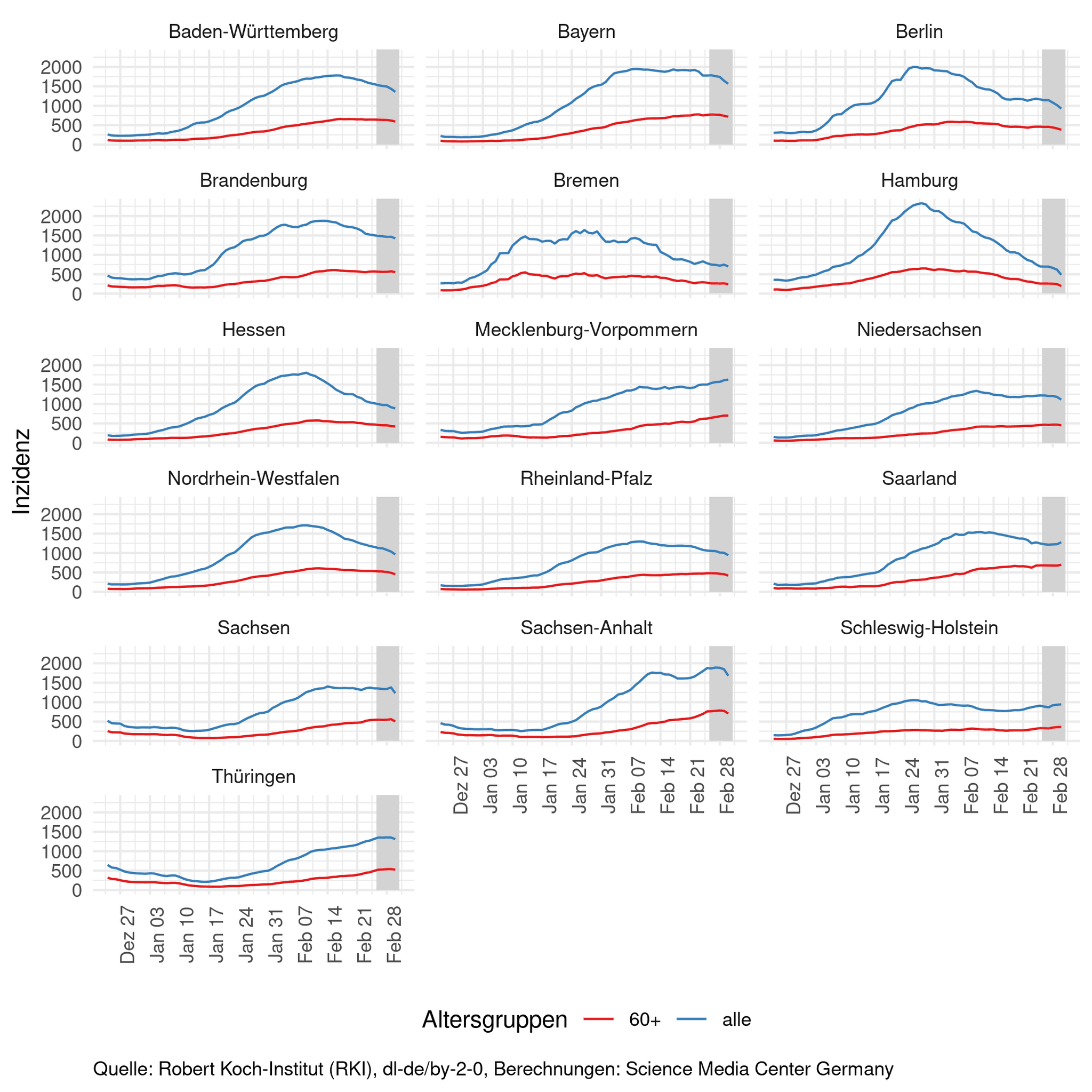 Im Folgenden wird das Wachstum der Inzidenz vom 26.02.2022 im Vergleich zur Vorwoche betrachtet. In Thüringen, Sachsen-Anhalt und Schleswig-Holstein steigen die Inzidenzen nennenswert, die bevölkerungsreichen Länder Bayern und Nordrhein-Westfalen weisen einen Inzidenzrückgang auf. In NRW sinkt auch die Inzidenz ab 60 Jahren.