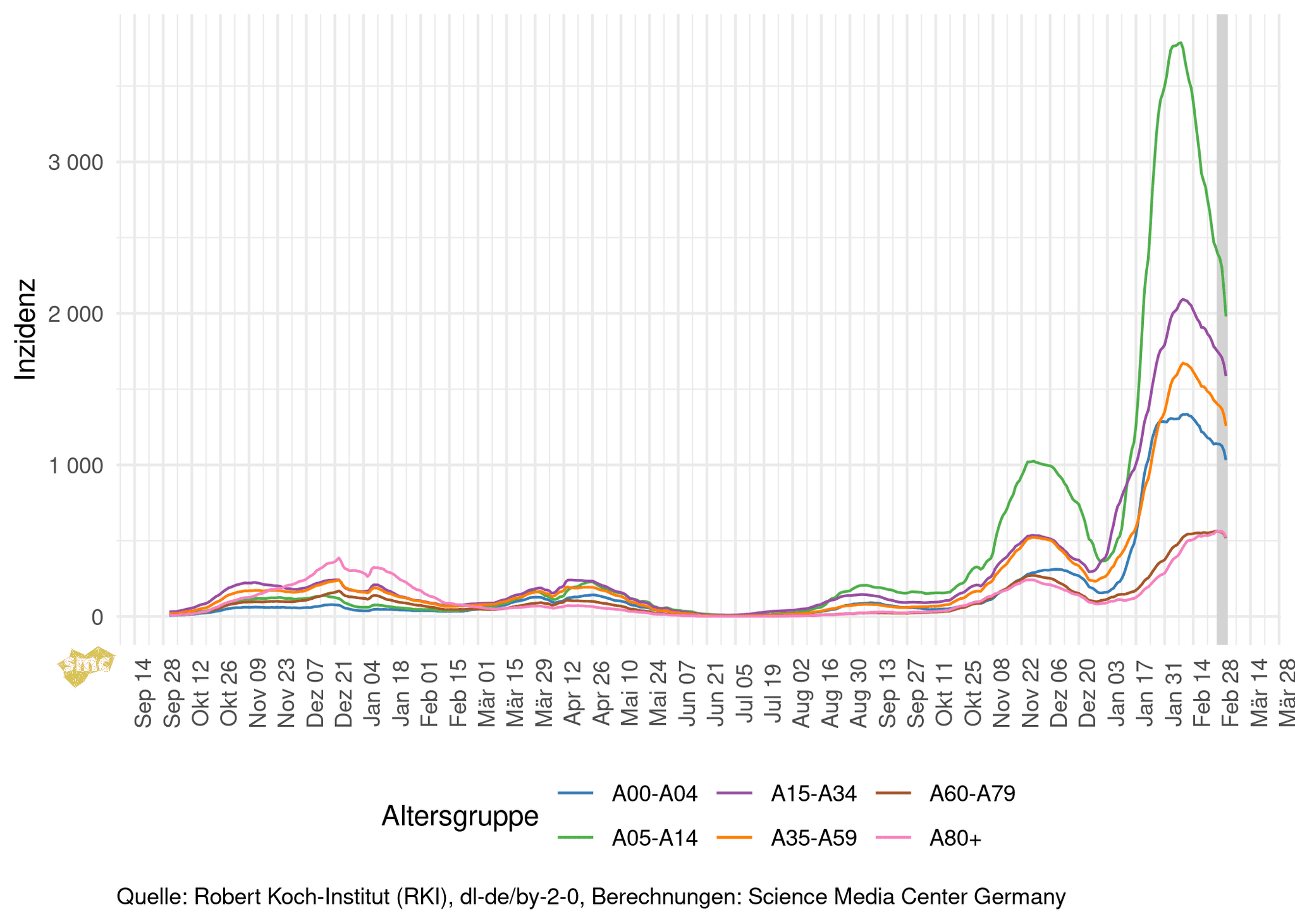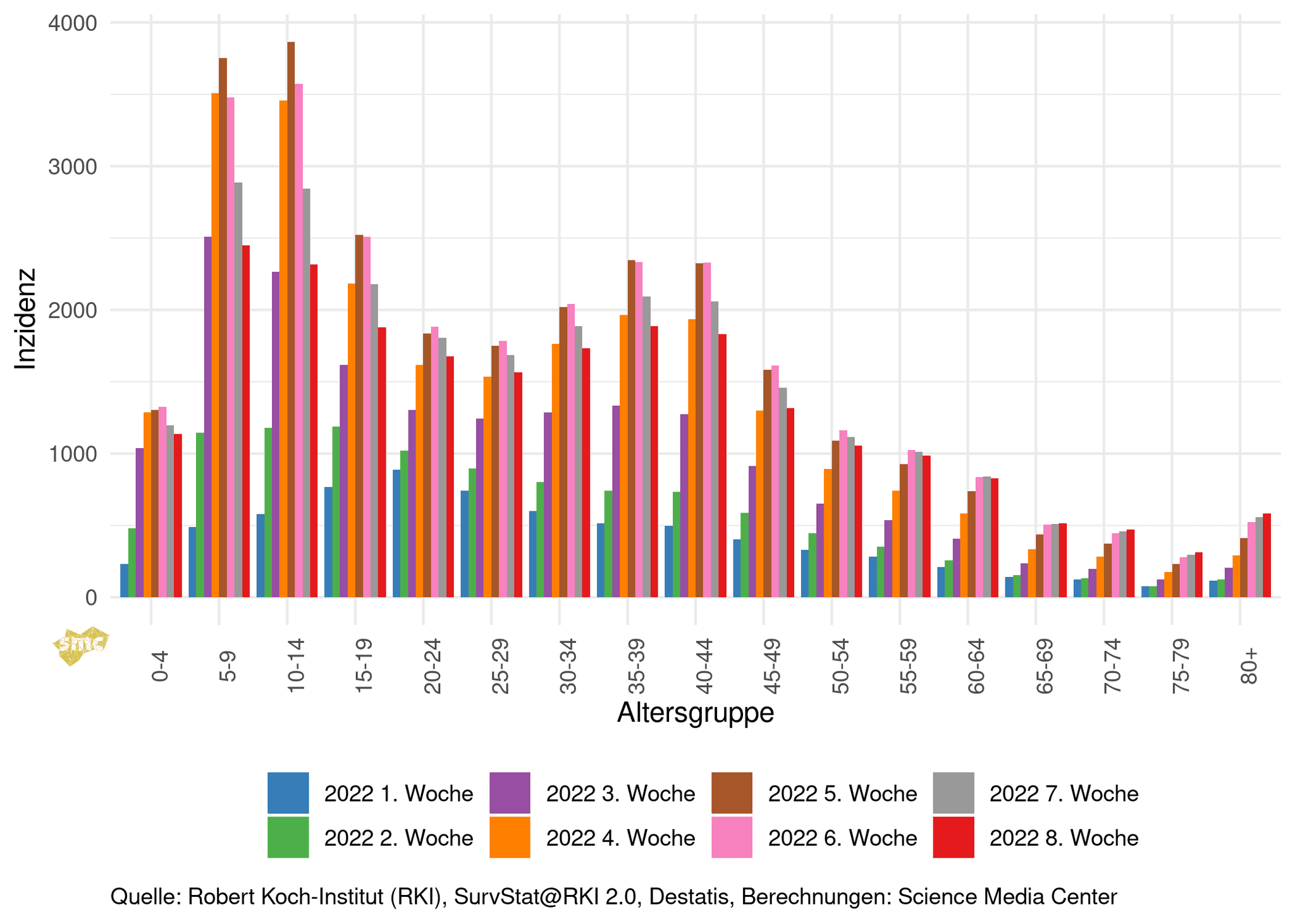 Die Grafik zeigt die Inzidenzen in den Altersgruppen nach Kalenderwoche.