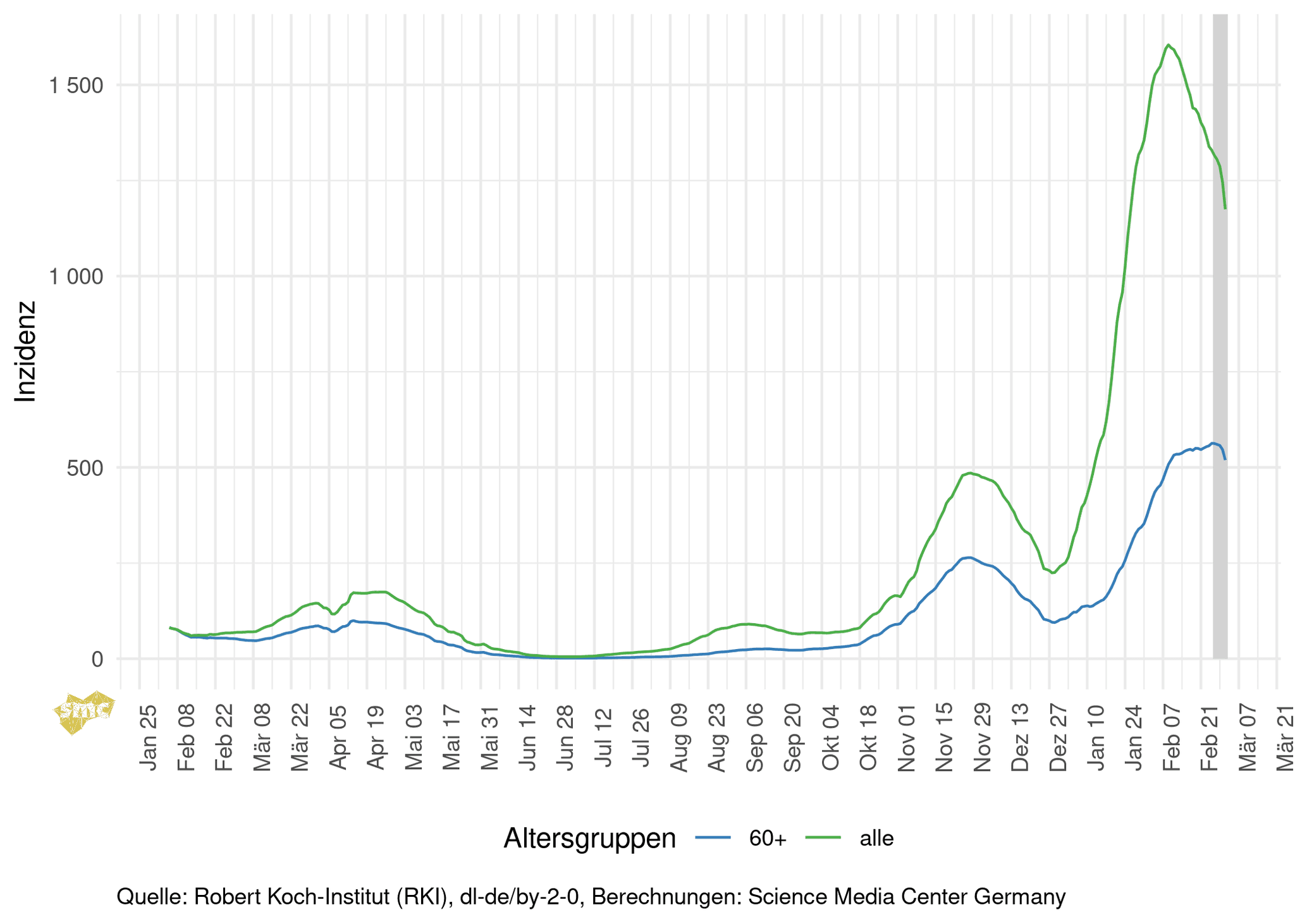 Die Grafik zeigt die Inzidenzen einmal für alle Altersgruppen und einmal ab 60 Jahren. Die Inzidenz sinkt in der Gesamtbevölkerung, in der oberen Altersgruppe ab 60 Jahren ist sie zuletzt nur sehr langsam gestiegen.
