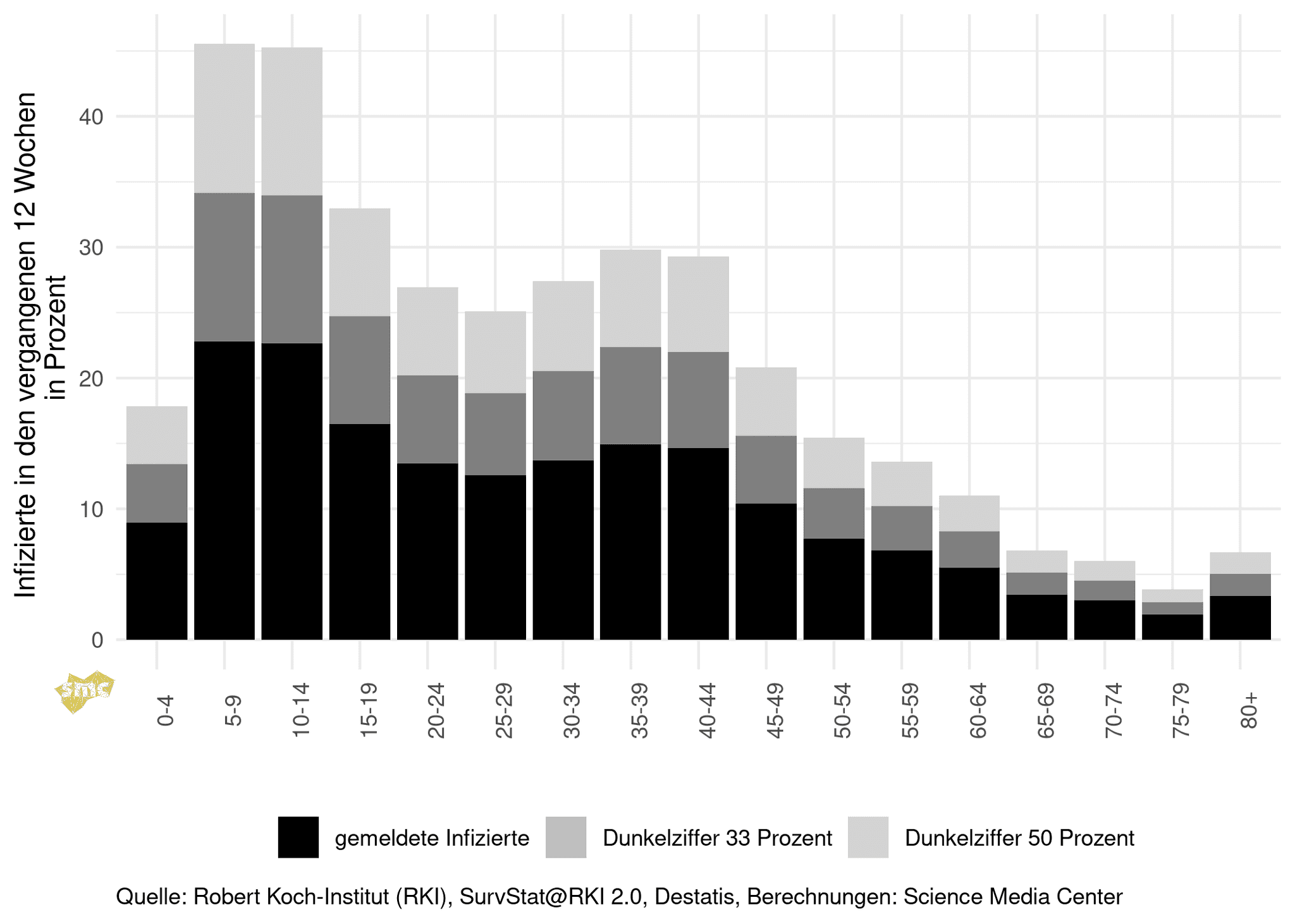Dass es in den kommenden Wochen tendenziell eher zu einer Entspannung kommt, zeigt die Zahl der bereits durchgemachten Infektionen in der Bevölkerung. Nimmt man eine Dunkelziffer an, die im Schnitt genauso hoch ist wie die gemeldeten Infektionen, waren in den vergangenen 12 Wochen etwa 45 Prozent der 5- bis 15-Jährigen infiziert, betrachtet man den gesamten Winter ab November, sind es sogar etwa 50 Prozent. Ohne einen nennenswerten Anteil an Reinfektionen kann die Inzidenz in diesen Altersgruppen mittelfristig nur noch sinken. Unter der Annahme einer Dunkelziffer von 50 Prozent liegt der Anteil der Infizierten im 12-Wochen-Zeitraum in den mittleren Altersgruppen bei 25 bis 30 Prozent. Dazu kommt noch eine höhere Impfquote. Auch hier ist das Potenzial also begrenzt.