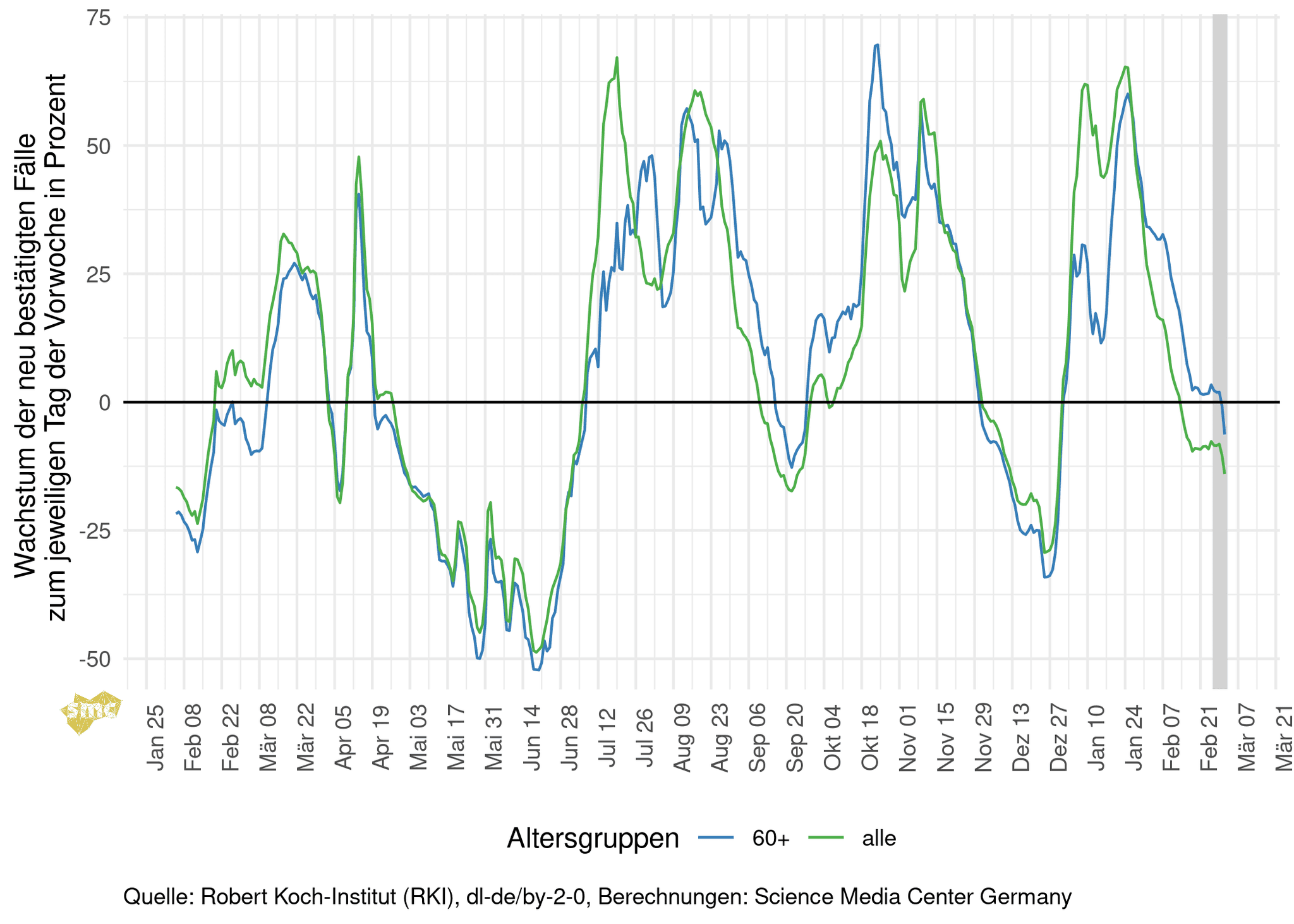 Die Grafik zeigt für jeden Tag das prozentuale Wachstum der geglätteten Fallzahlen im Vergleich zur Vorwoche. Dabei werden einmal alle gemeldeten Fälle berücksichtigt und einmal nur Fälle mit einem Alter von mindestens 60 Jahren. Das Wachstum in der Altersgruppe ab 60 Jahren liegt nur noch knapp über Null. Das Gesamtwachstum ist negativ, der Rückgang beschleunigt sich aber zur Zeit nicht.