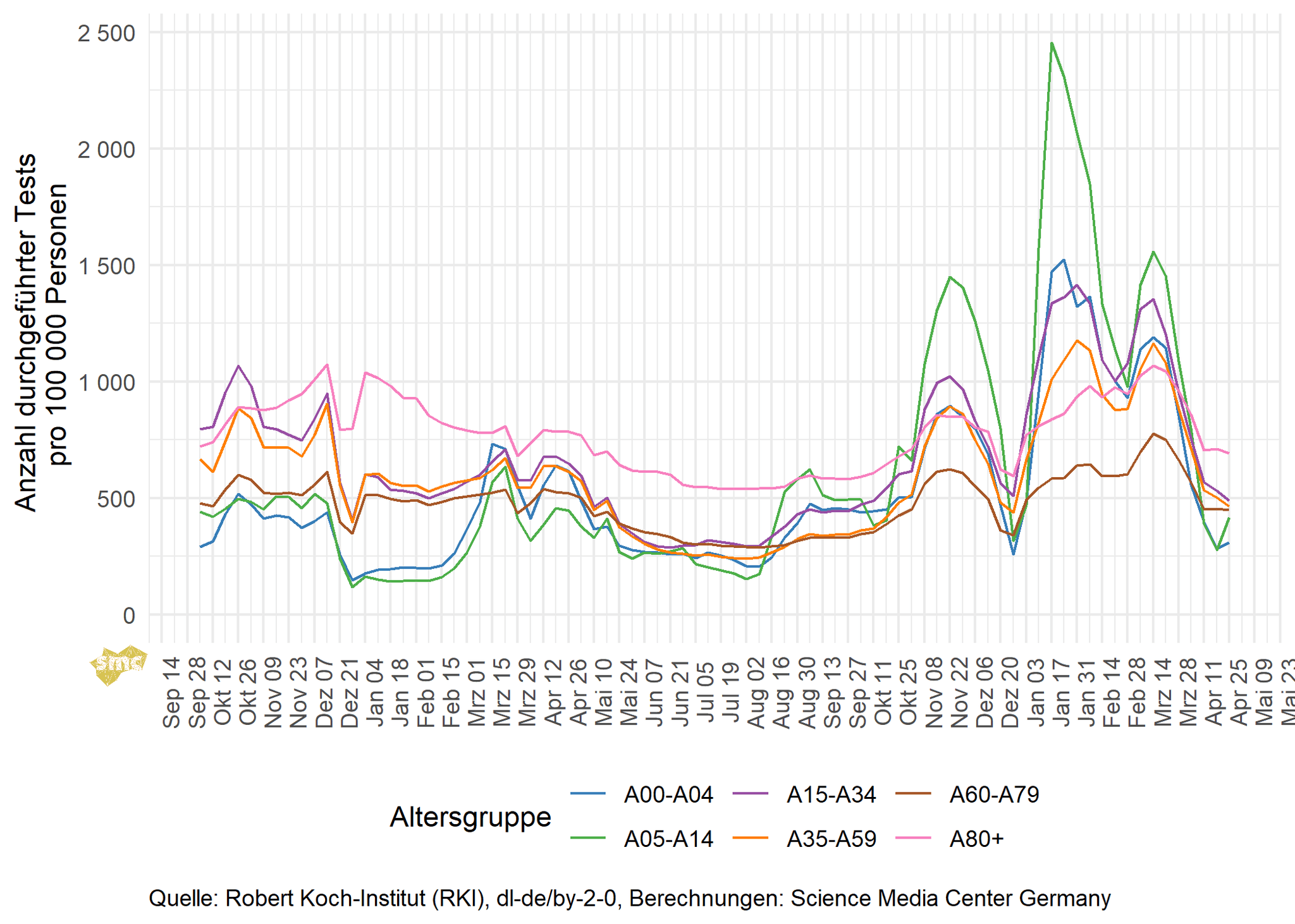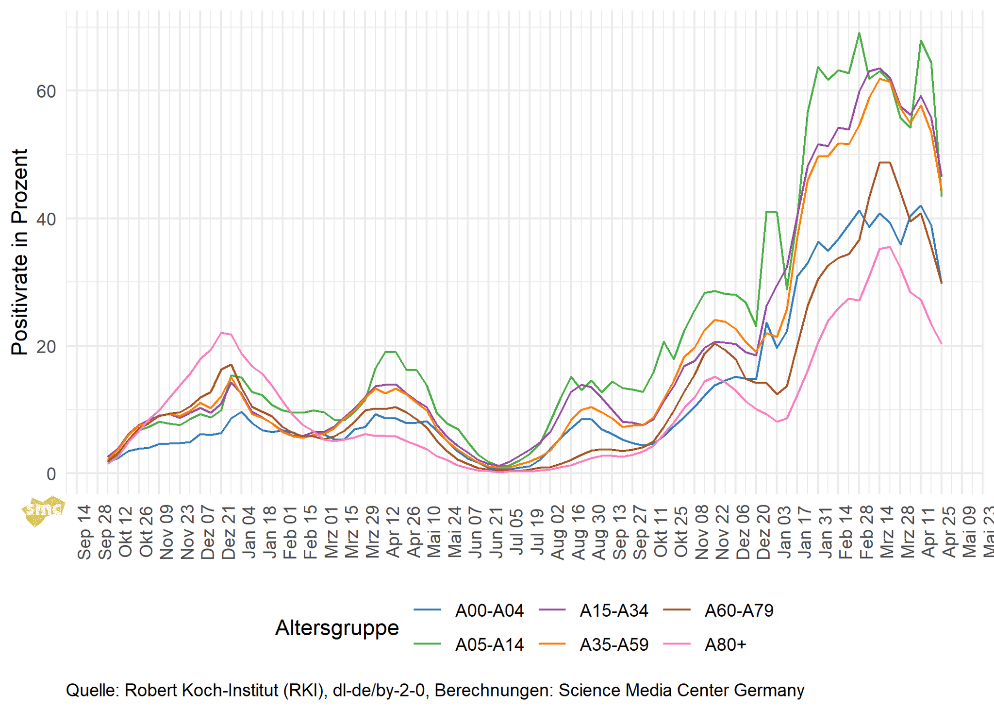 Die Testpositivrate sinkt in allen Altersgruppen.