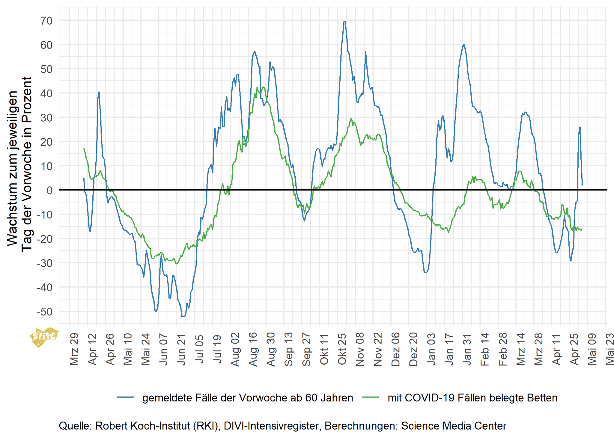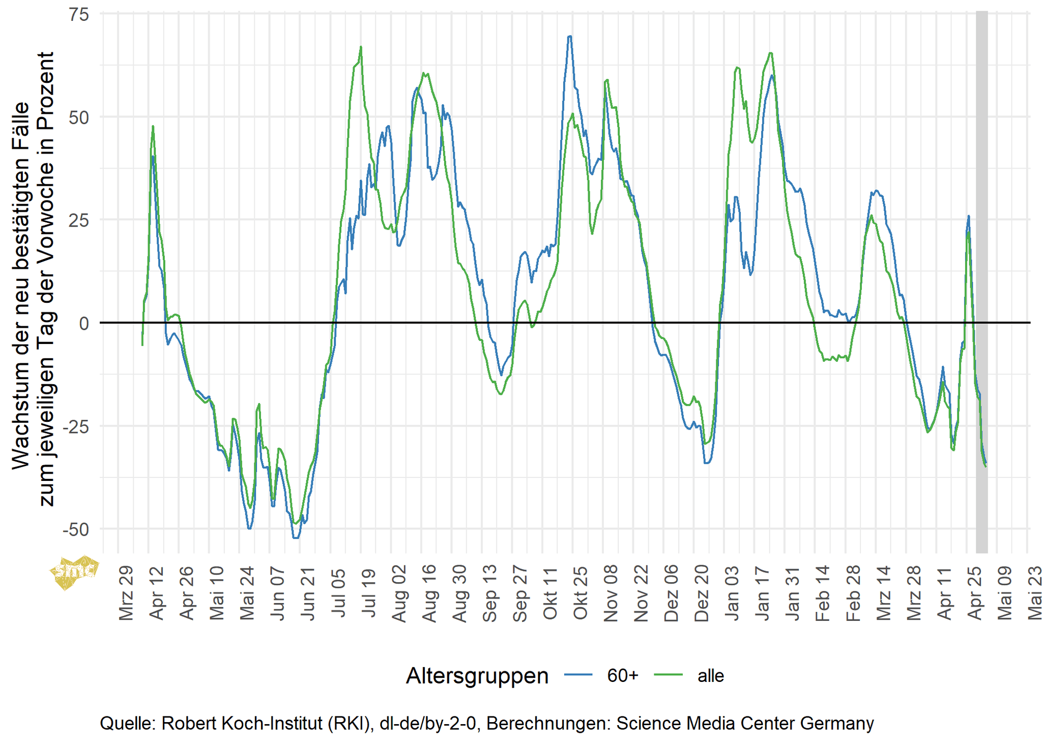 Die Grafik zeigt für jeden Tag das prozentuale Wachstum der geglätteten Fallzahlen im Vergleich zur Vorwoche. Dabei werden einmal alle gemeldeten Fälle berücksichtigt und einmal nur Fälle mit einem Alter von mindestens 60 Jahren. Das Wachstum ist aktuell eindeutig negativ. Die Inzidenzen gehen deutlich zurück.