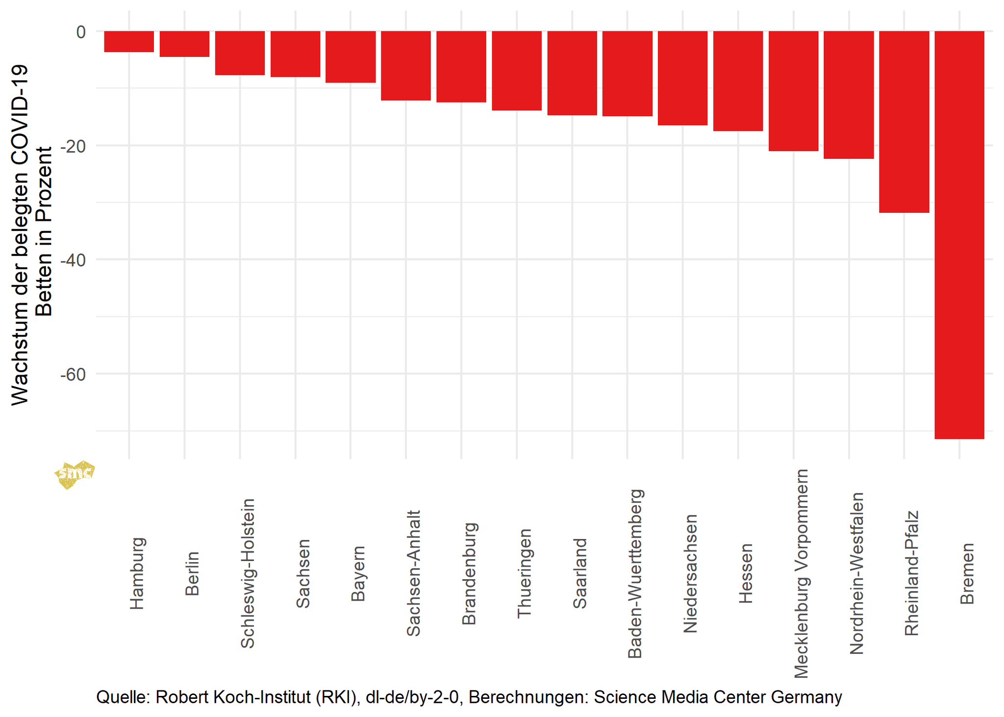 Der Rückgang der Zahl der mit COVID-19-Fällen belegten Betten liegt recht konstant bei über 15 Prozent.