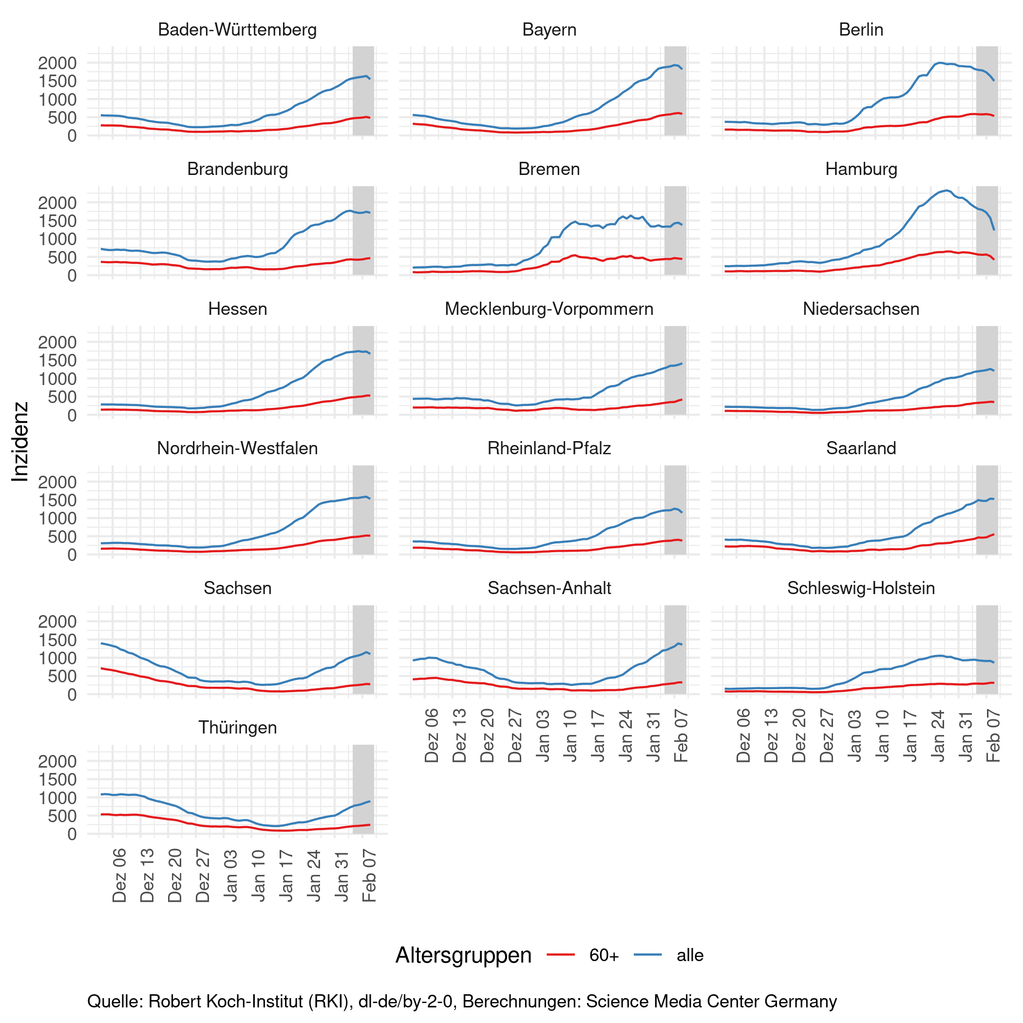 In den Stadtstaaten und in Schleswig-Holstein zeichnet sich ein Rückgang der Inzidenzen ab. Durch die stetige Änderung der Teststrategie kann nicht immer sicher beurteilt werden, welchen Anteil das Meldewesen hat. Die Zahl der durchgeführten Tests pro Person ist zuletzt nicht nennenswert gestiegen, die Positivrate steigt laut ALM e.V. aber weiterhin. In den oben genannten Bundesländern stagniert die Positivrate laut ARS-Wochenbericht aber oder geht sogar leicht zurück. Insgesamt hat sich das Wachstum der Meldeinzidenz in den unteren Altersgruppen stark reduziert. Hier werden aber erst die kommenden Wochen zeigen, welchen Anteil die Teststrategie und welchen die wirklich zu erwartende Trendwende hat.