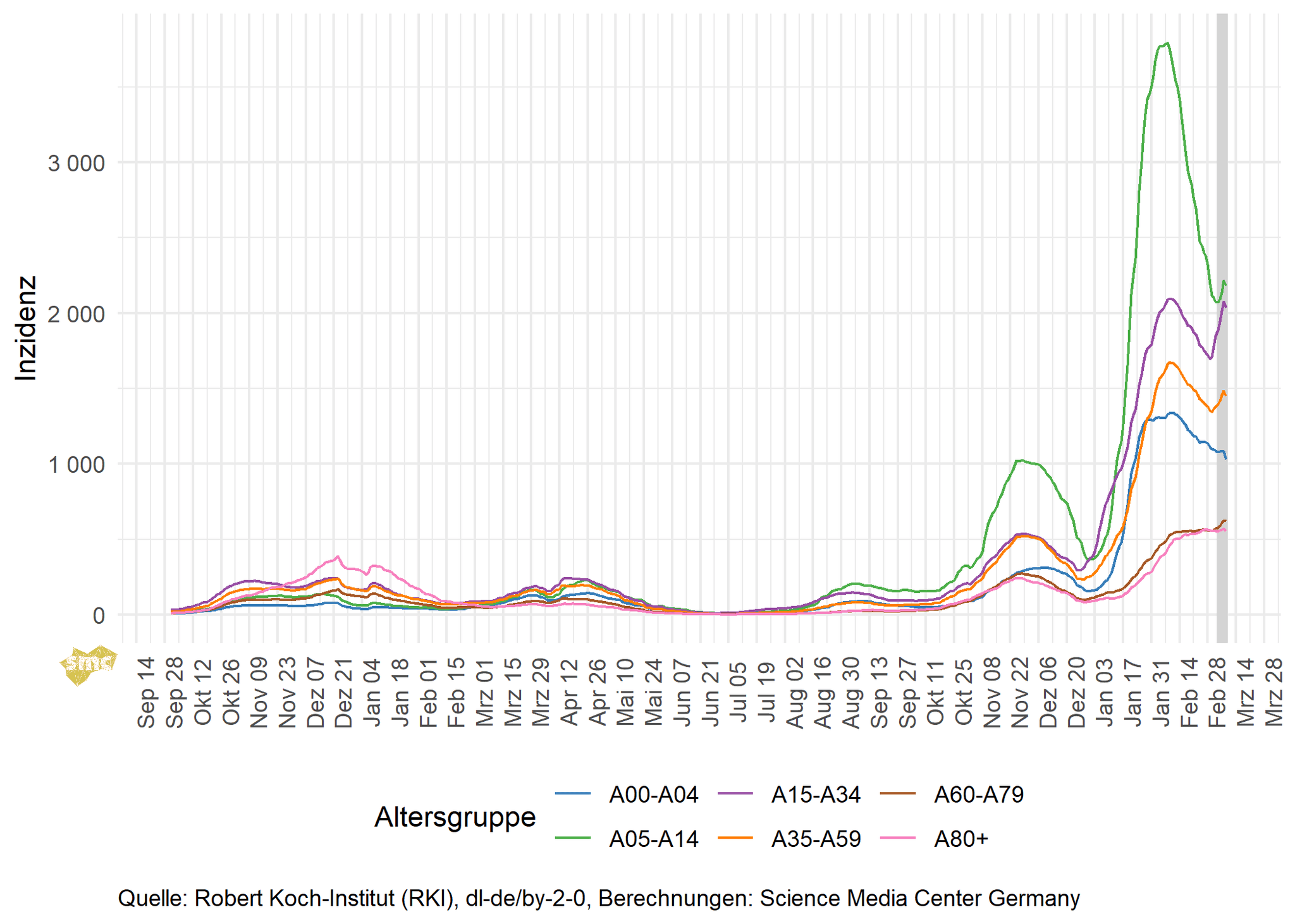 Die Inzidenzen steigen wieder in fast allen Altersgruppen. Die sinkenden Inzidenzen bei den Schulkindern könnten der geänderten Teststrategie und der hohen Zahl von Infektionen in den vergangenen Wochen geschuldet sein.