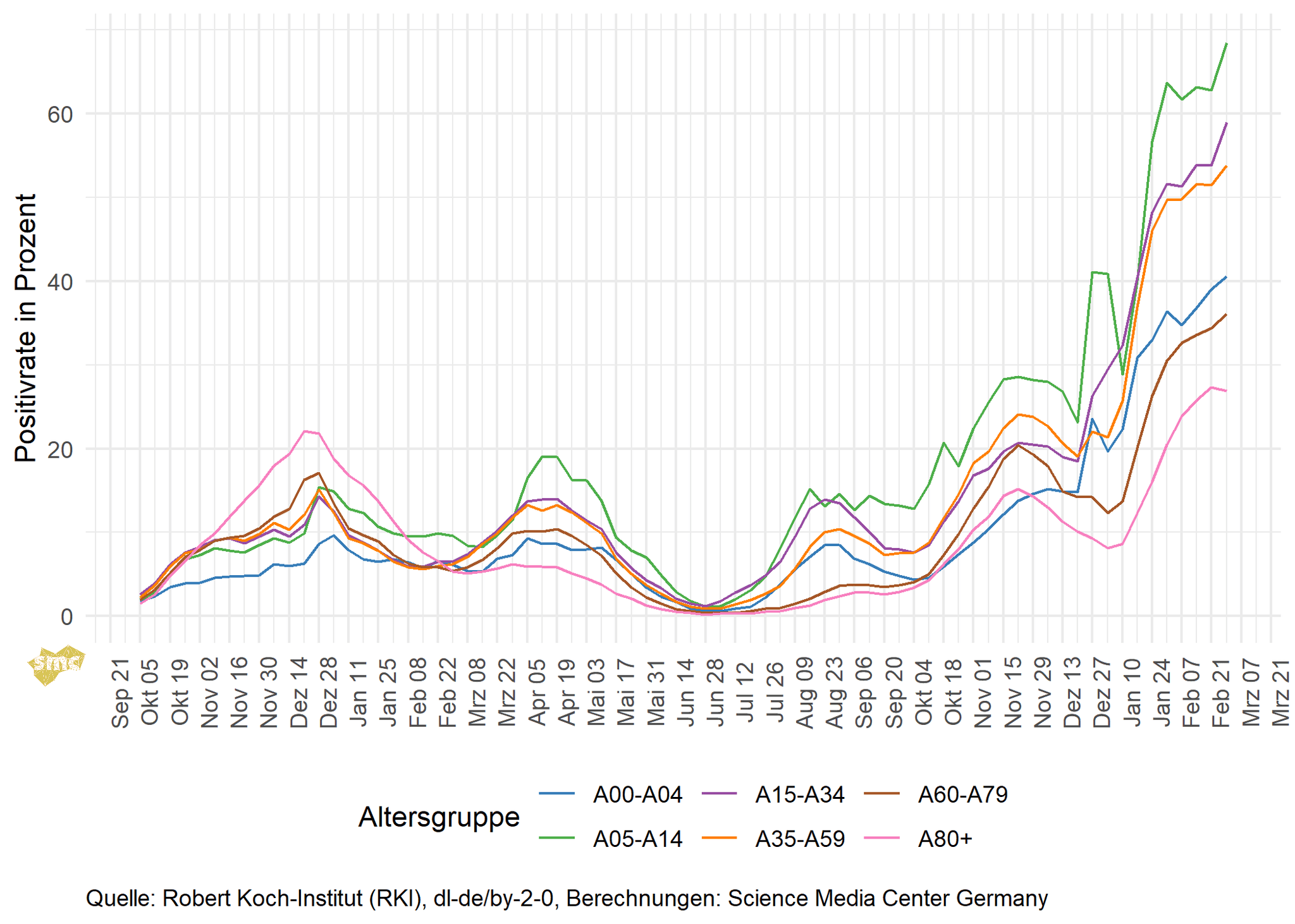 Die Testpositivrate steigt in fast allen Altersgruppen, was auf eine steigende Dunkelziffer in der gesamten Bevölkerung hindeutet. Nur in der Altersgruppe ab 80 Jahren ist die Testpositivrate zuletzt minimal gesunken.