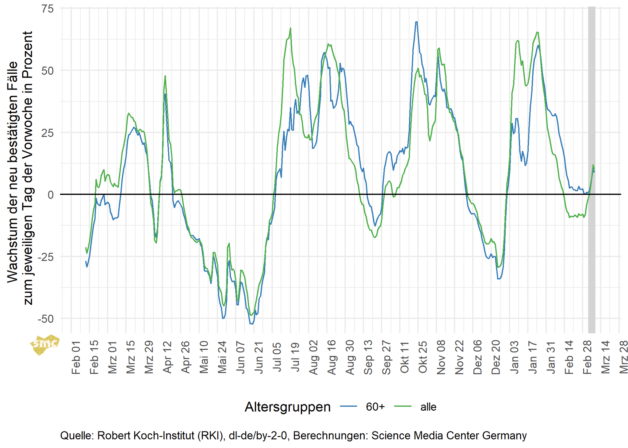 Die Grafik zeigt für jeden Tag das prozentuale Wachstum der geglätteten Fallzahlen im Vergleich zur Vorwoche. Dabei werden einmal alle gemeldeten Fälle berücksichtigt und einmal nur Fälle mit einem Alter von mindestens 60 Jahren. Das Wachstum in der Altersgruppe ab 60 Jahren und das Gesamtwachstum steigen aktuell gleichzeitig.