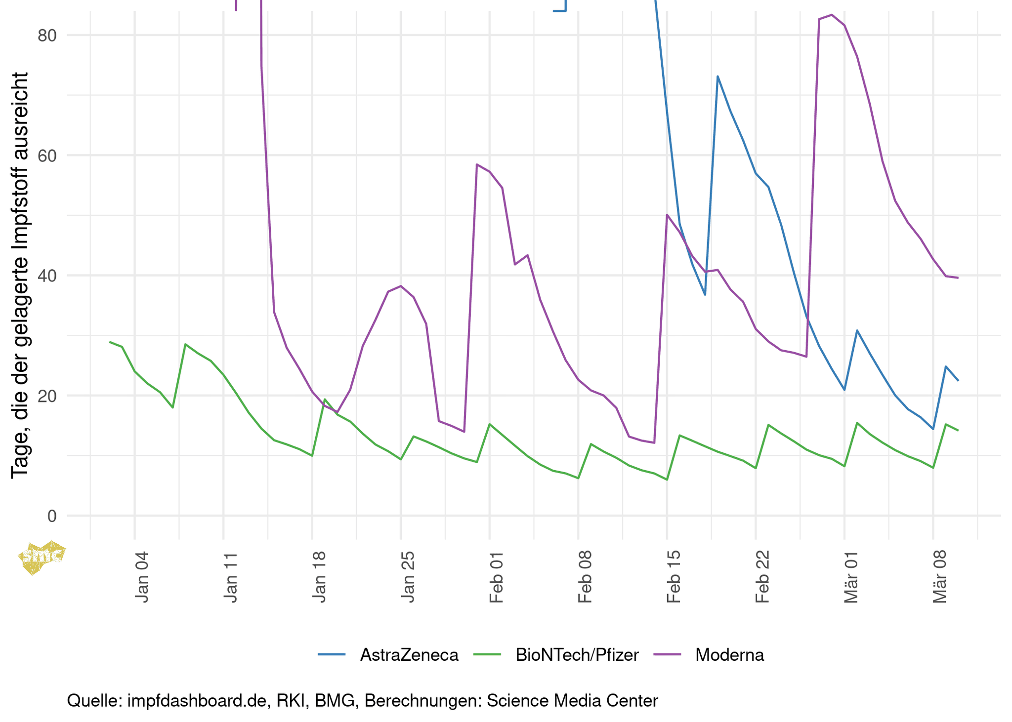 Der Impfstoff von BioNTech/Pfizer wird inzwischen wöchentlich geliefert und größtenteils bis zur nächsten Lieferung verimpft. Da die Lieferungen bis Ende März konstant bleiben, wird sich hier nicht viel ändern. Bei Moderna sind die Lieferungen seltener und die Impfstoffmenge ist vergleichsweise klein. Die Ausschläge nach einer Lieferung sind hier größer. Bei AstraZeneca sinkt die Zahl der gelagerten Dosen im Vergleich zu den täglich verimpften Dosen. Da die Lieferungen der nächsten Wochen laut Gesundheitsministerium geringer ausfallen werden, ist weiterhin eine sinkende Tendenz zu erwarten.