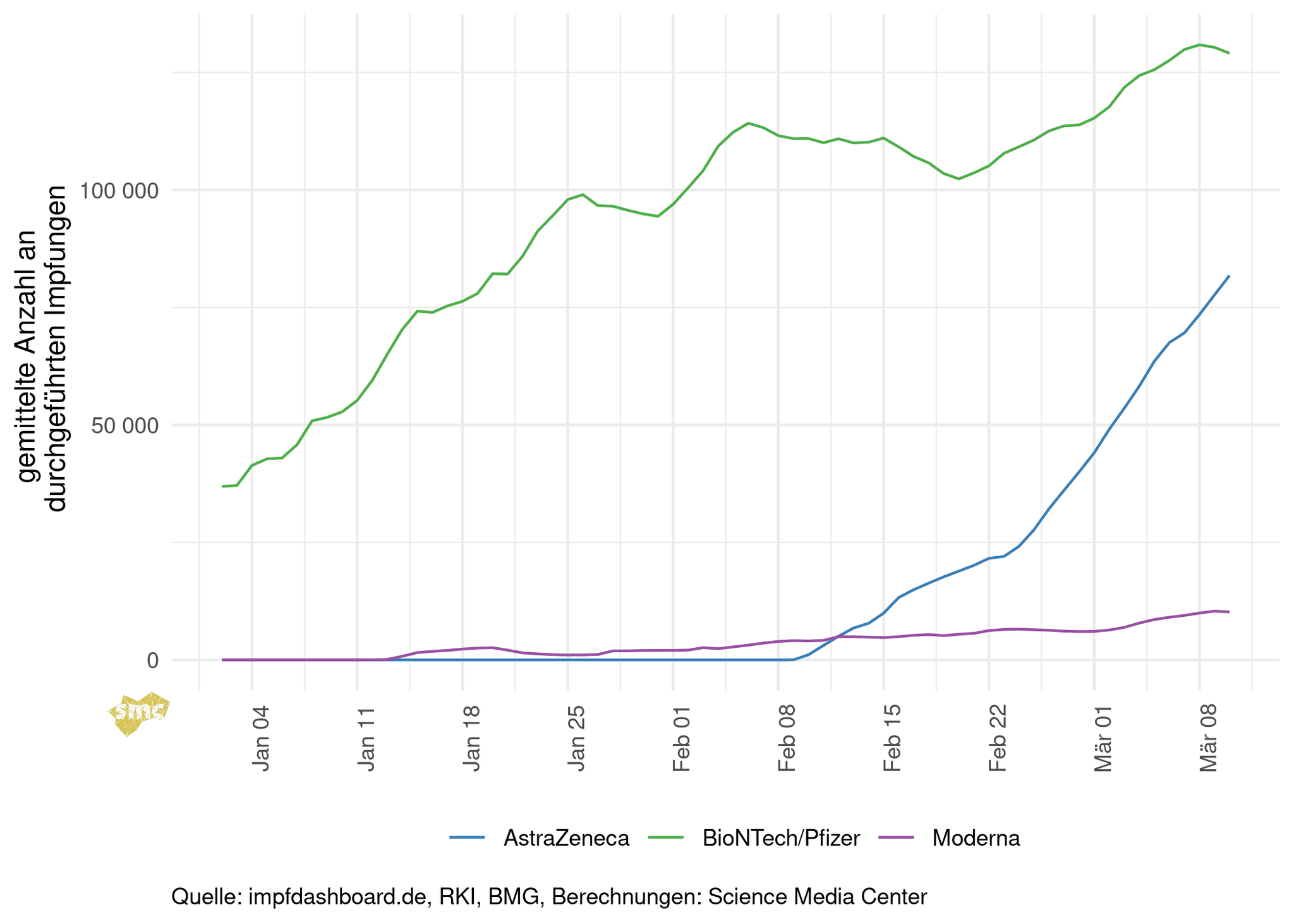 Betrachtet man die geglättete Zahl der täglich durchgeführten Impfungen nach Hersteller, sieht man, dass insbesondere die Zahl der mit dem AstraZeneca-Impfstoff geimpften Personen stark zunimmt. Bei den Impfungen mit dem Impfstoff von BioNTech/Pfizer wird aktuell fast so viel verimpft wie geliefert wird, eine größere Steigerung ist hier ohne zusätzliche Lieferungen nicht zu erwarten.