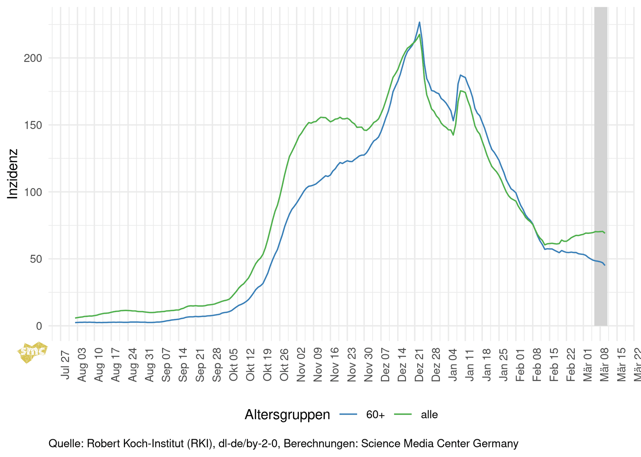 Die Grafik zeigt die Inzidenzen einmal für alle Altersgruppen und einmal ab 60 Jahren. Die Inzidenz steigt weiterhin leicht. In den oberen Altersgruppen sinkt sie hingegen ab.