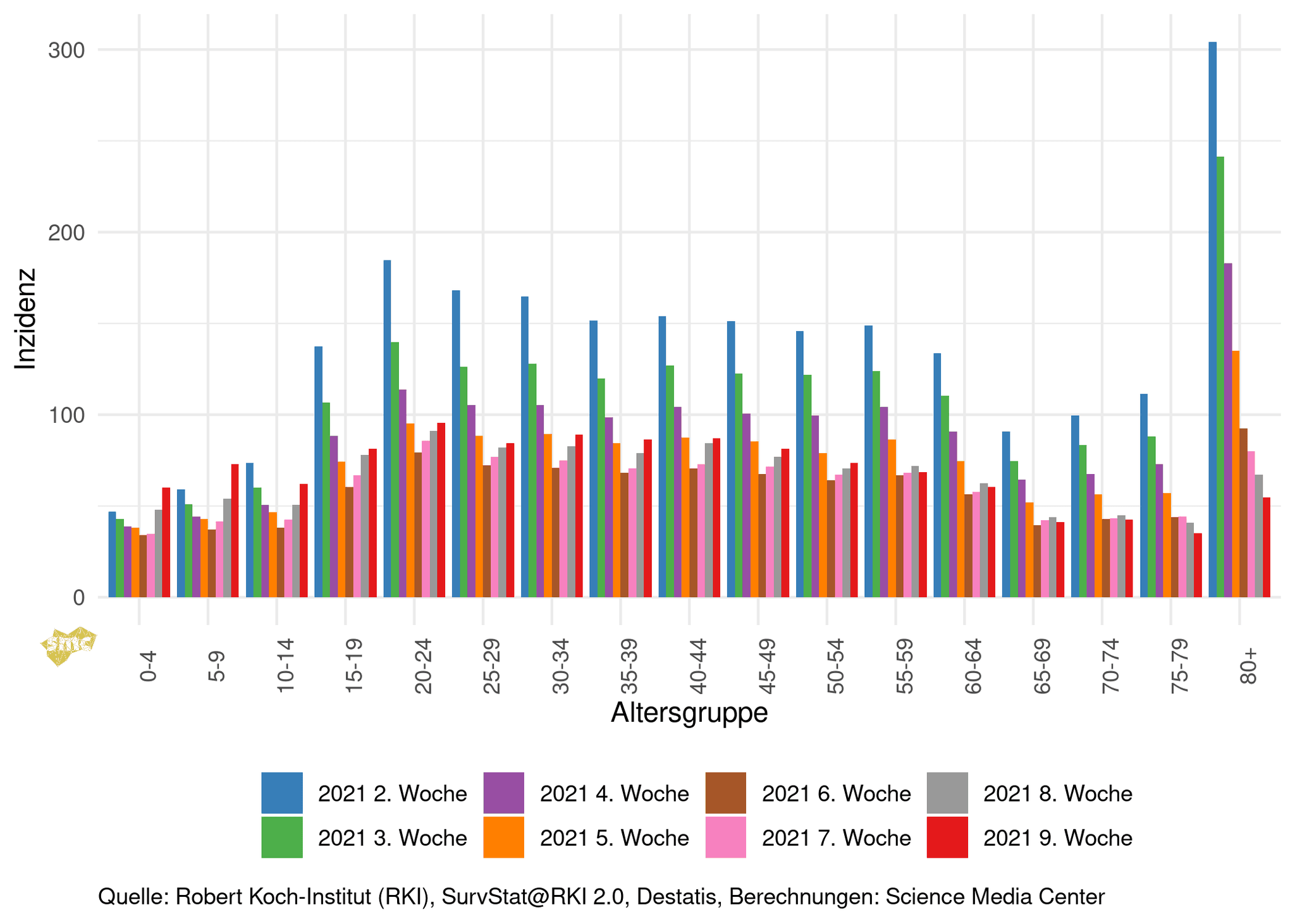 Die Grafik zeigt die Inzidenzen in den Altersgruppen nach Kalenderwoche.