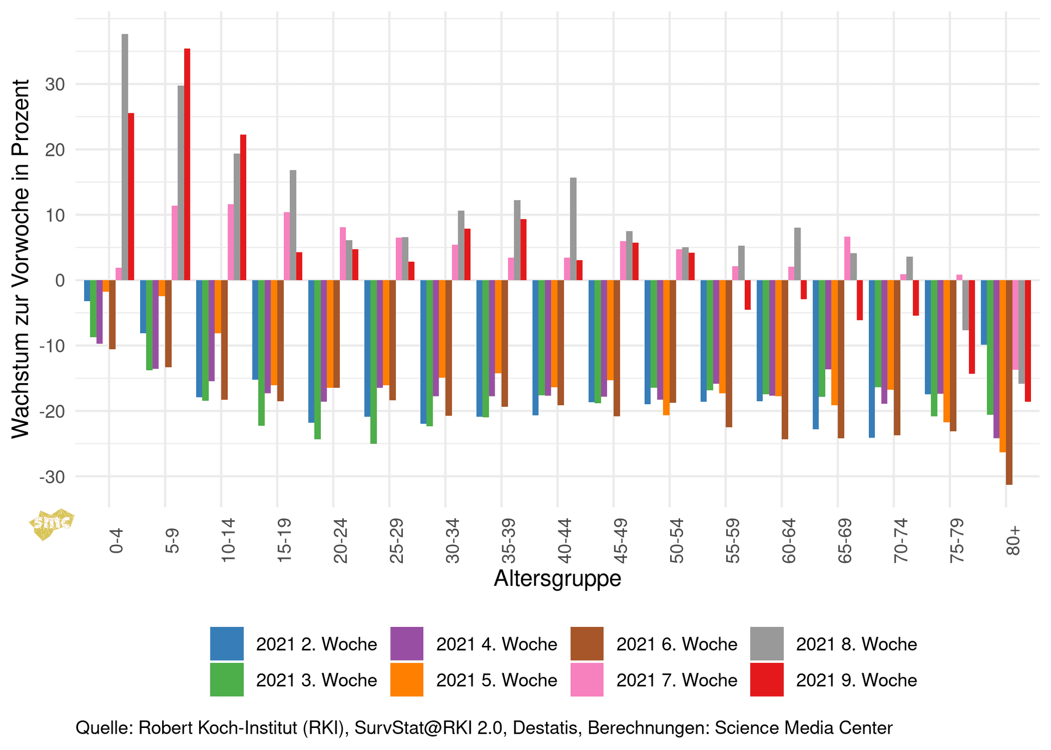 Die Inzidenzen steigen in den unteren Altersgruppen. In der Altersgruppen ab 55 Jahren sinken die Fallzahlen. Die hohen prozentualen Steigerungen in den unteren Altersgruppen dürften den vermehrten Tests in Schulen und KiTas zuzuschreiben sein.