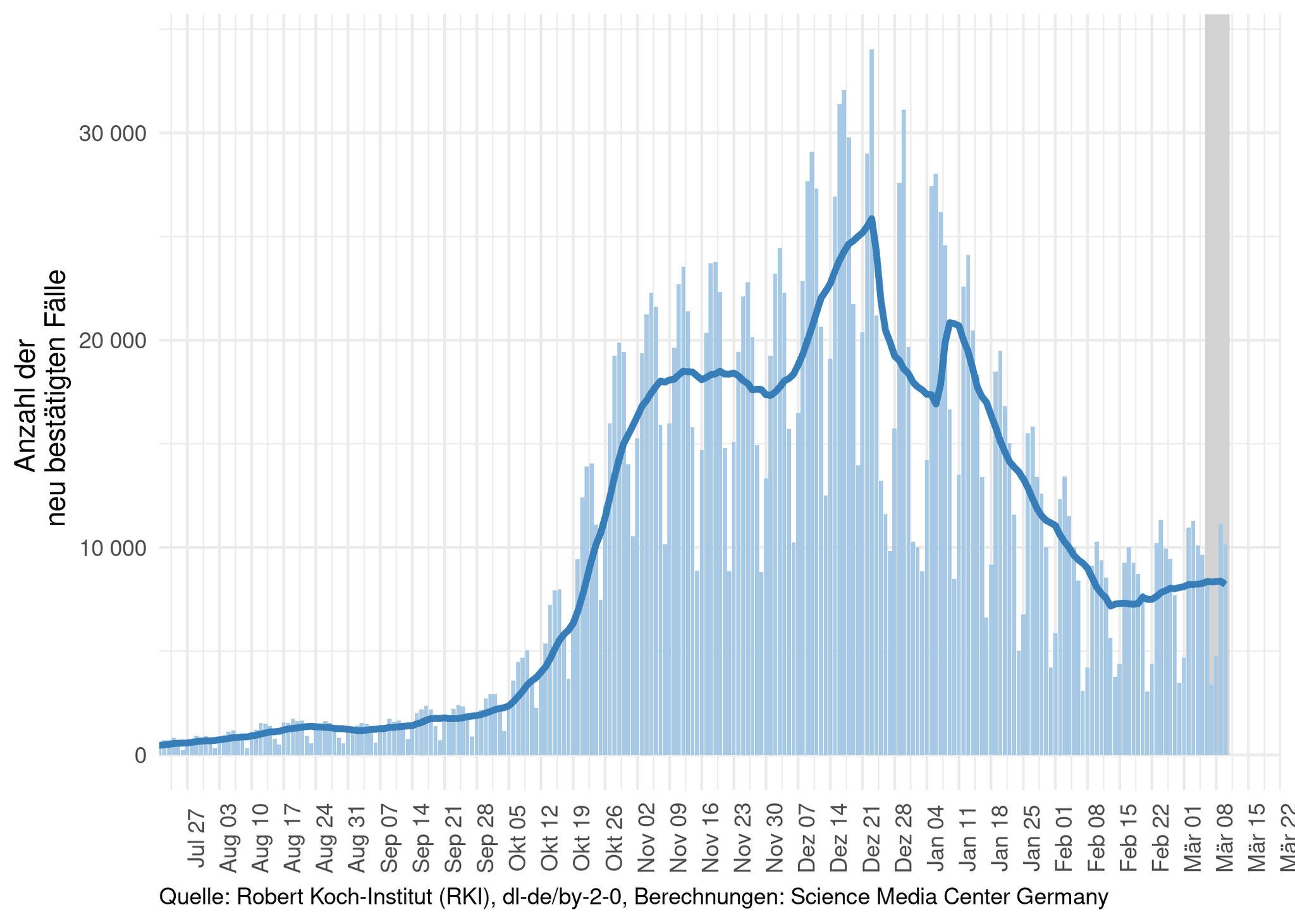 Da die Zahl der neu bestätigten Infektionsfälle (blaue Balken) im Wochenrhythmus schwankt, wird an dieser Stelle auch ein Mittelwert der jeweils vergangenen sieben Tage angegeben (blaue Linie). Da die vergangenen sieben Tage betrachtet werden, läuft dieser Wert den Meldezahlen immer etwas nach.