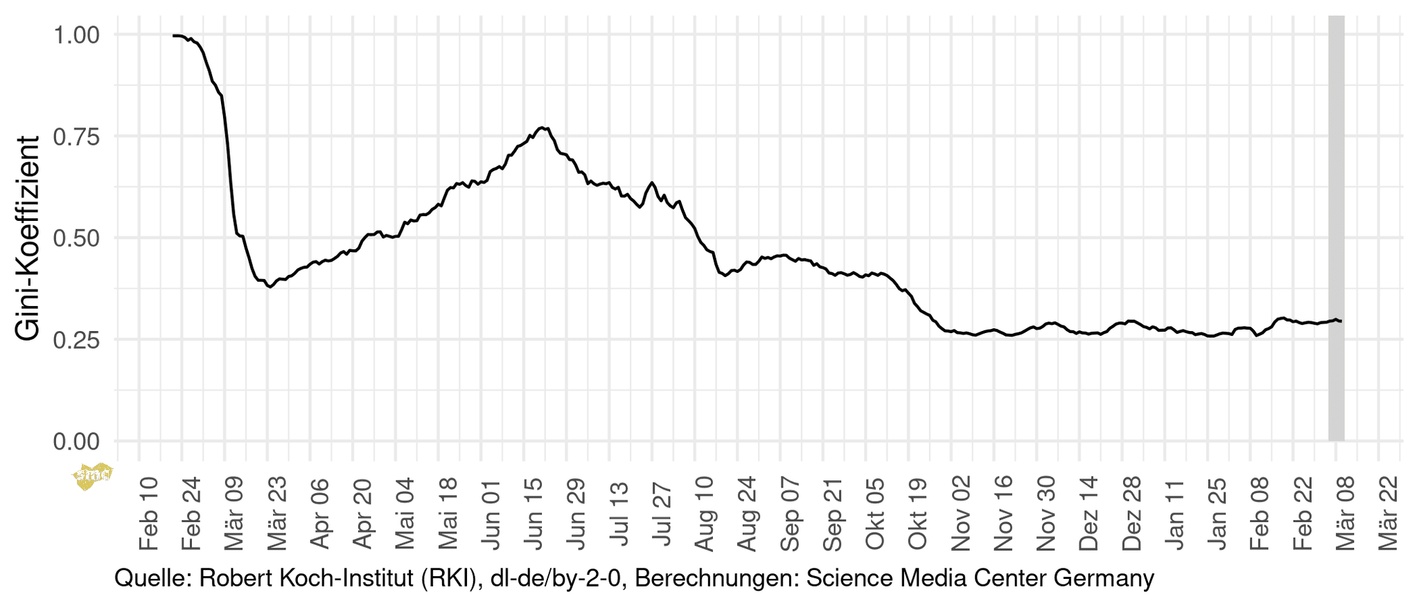 Ende Februar war die Ungleichheit bei den gemeldeten Fällen noch sehr groß, fiel dann aber mit steigender Fallzahl ab, da sich das Virus über Deutschland verteilte. Auch in den Hochzeiten waren die gemeldeten Inzidenzen nicht gleichmäßig verteilt.