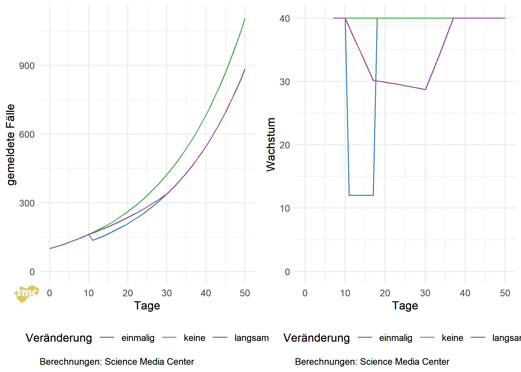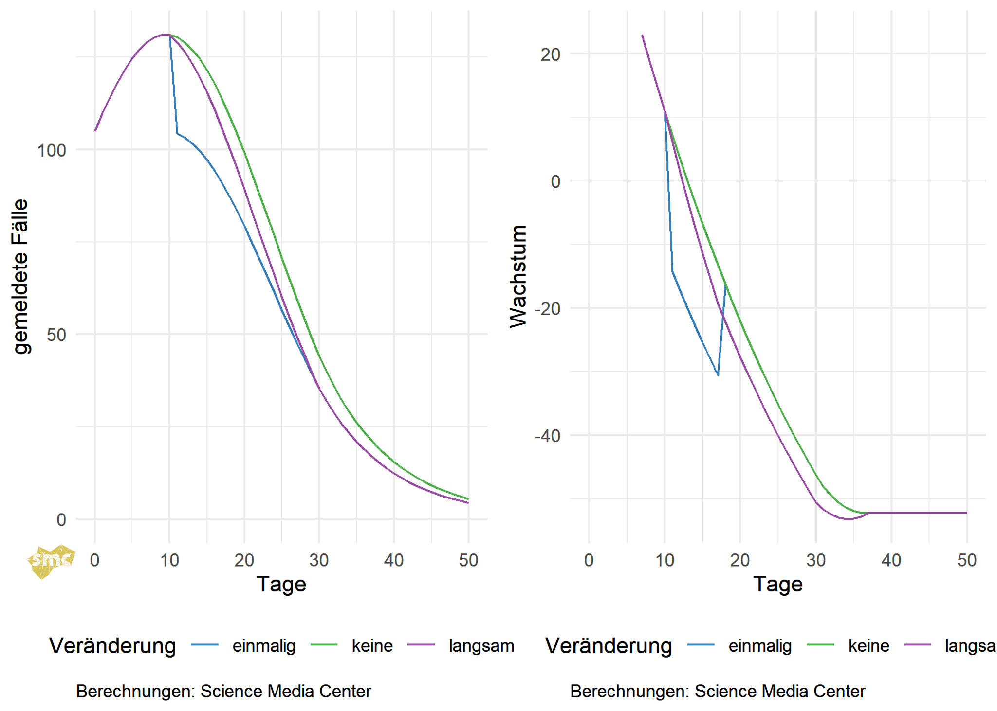 Während die absoluten Fallzahlen mit der geänderten Strategie in beiden Szenarien am Ende niedriger ausfallen, ist die Entwicklung bei der Wachstumsberechnung interessant: Da das Wachstum im Vergleich zur Vorwoche berechnet wird, ist der Effekt des Strategiewechsels in der abrupten Variante schon nach einer Woche nicht mehr vorhanden. Im langsamen Szenario dauert dies etwas länger (bei den hier gewählten Zahlen sind es 27 Tage). Das Wachstum ist also deutlich robuster gegen eine solche Art von Strategiewechsel und kann schnell wieder als Maßzahl verwendet werden.