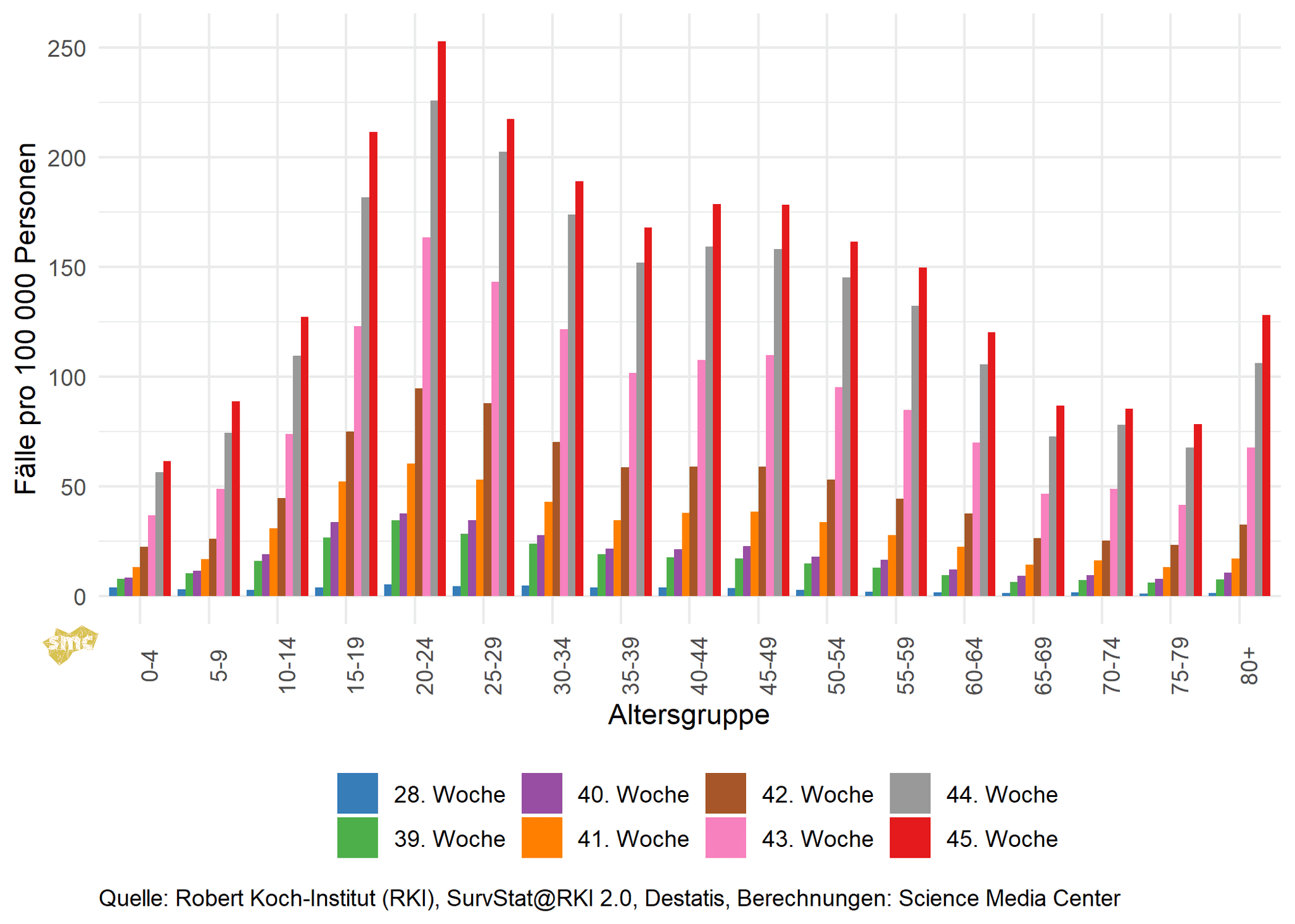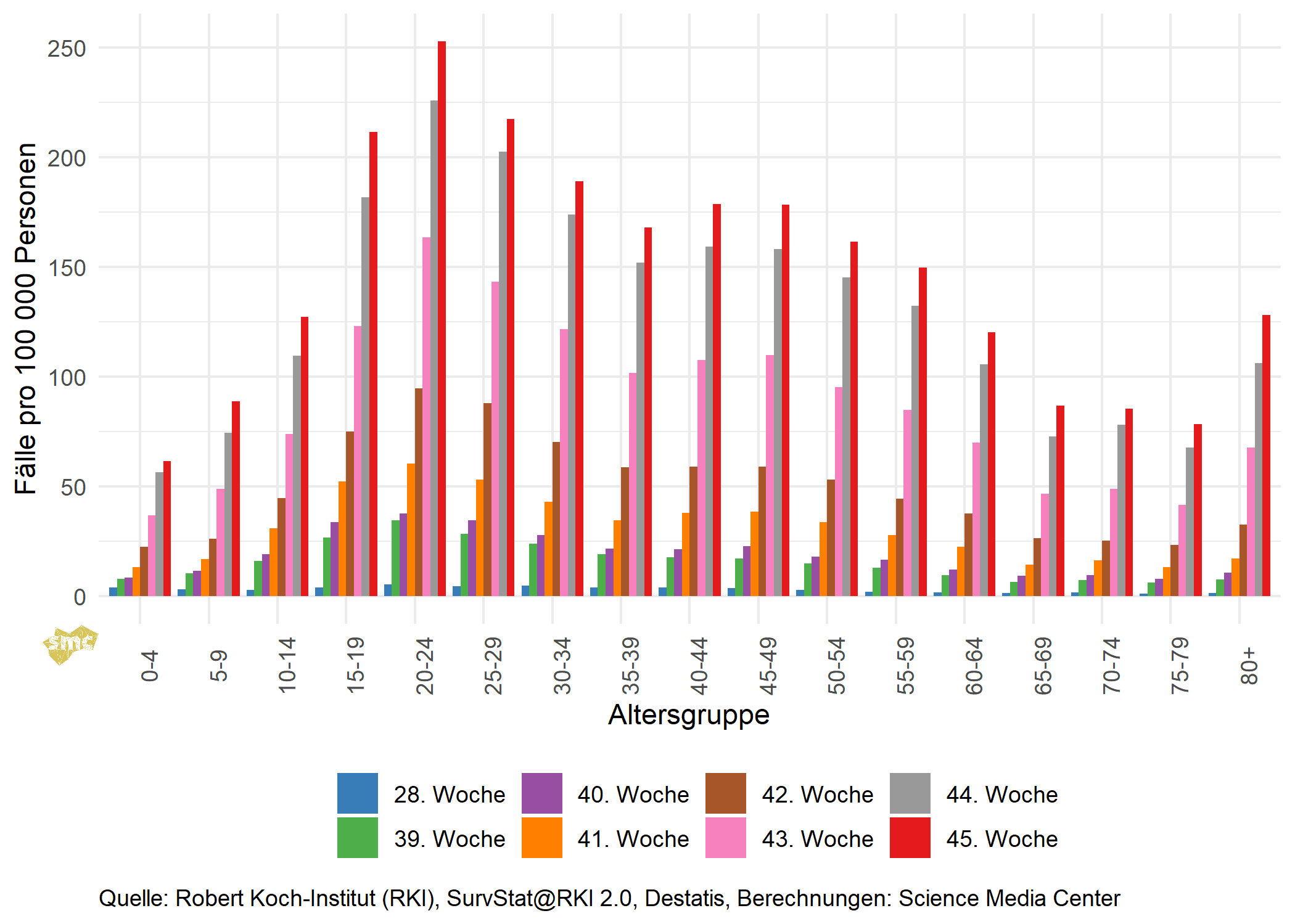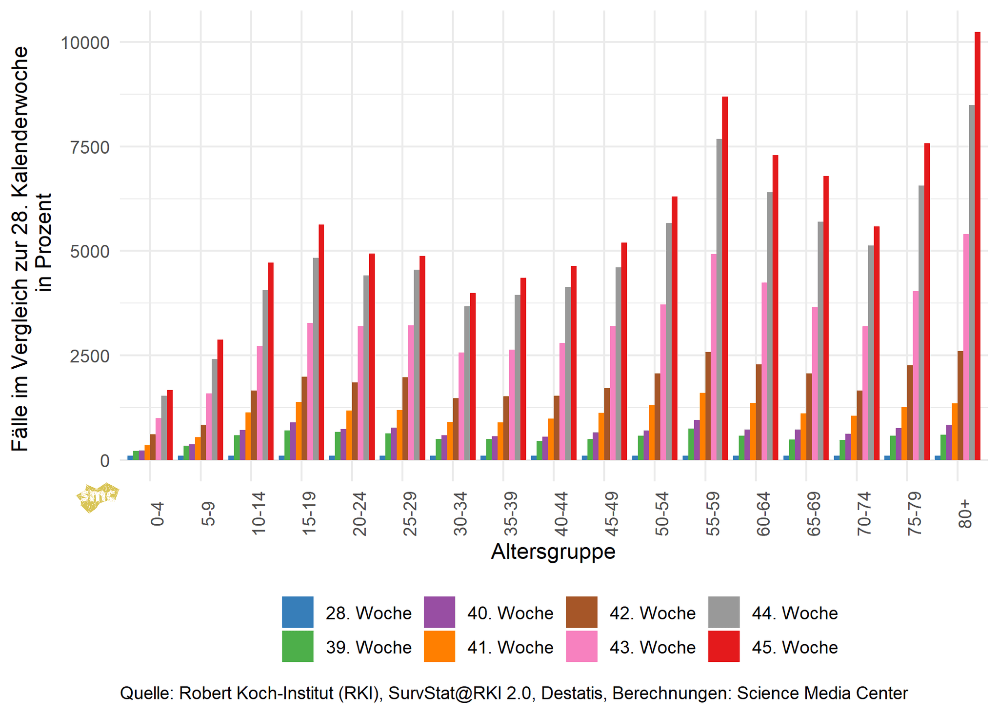 Aktuell steigen die gemeldeten Fälle pro 100 000 Personen in allen Altersgruppen an. Die älteren Altersklassen weisen weiterhin deutlich niedrigere Fallzahlen pro 100 000 Personen auf, relativ gibt es hier aber weiterhin starke Anstiege. Inzwischen liegt das prozentuale Wachstum allen Altersgruppen jenseits der 50 Jahre höher als in den unteren Altersgruppen.