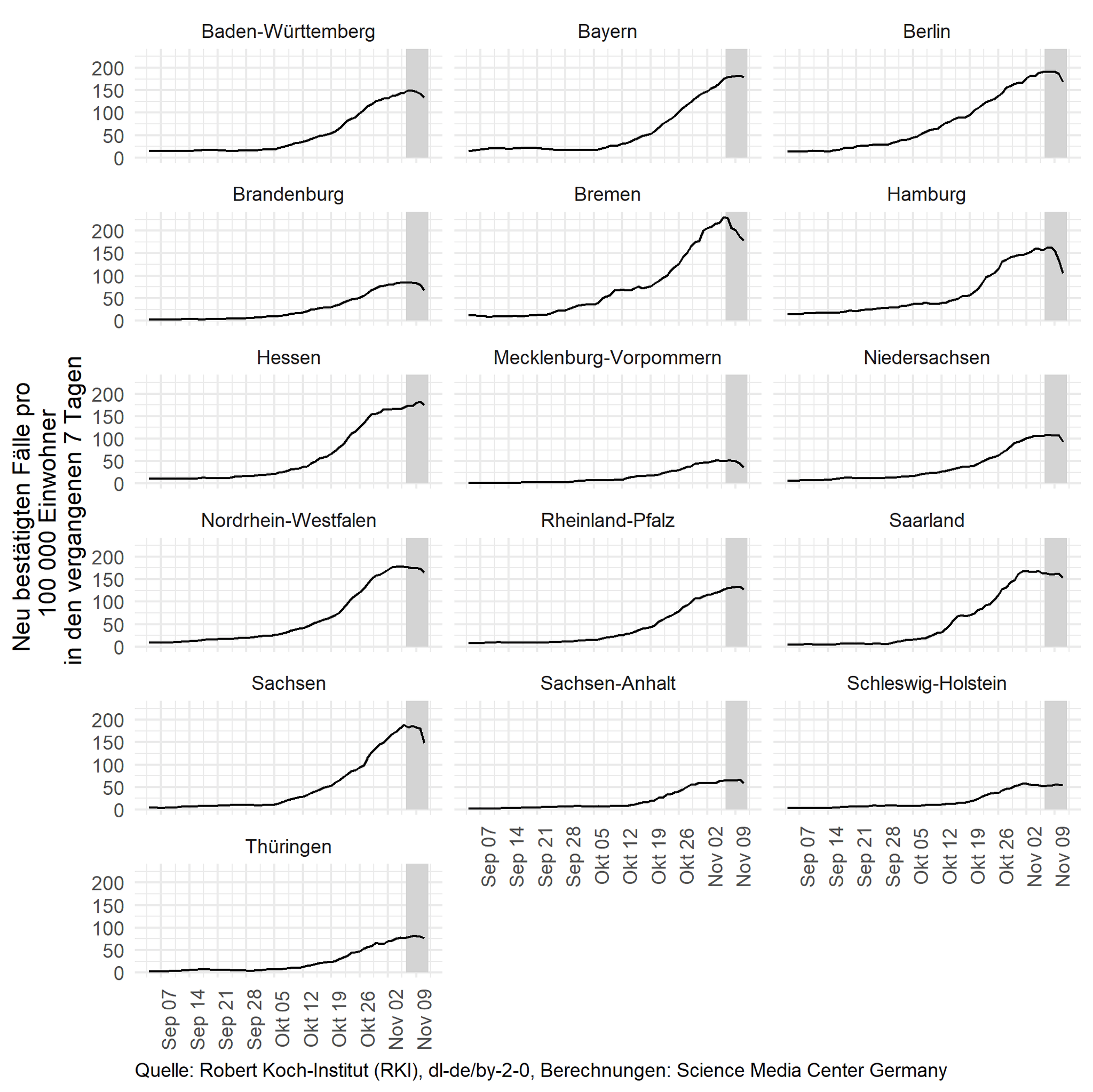 In den vielen Bundesländern stabilisiert sich die Fallzahlen pro 100 000 Personen.