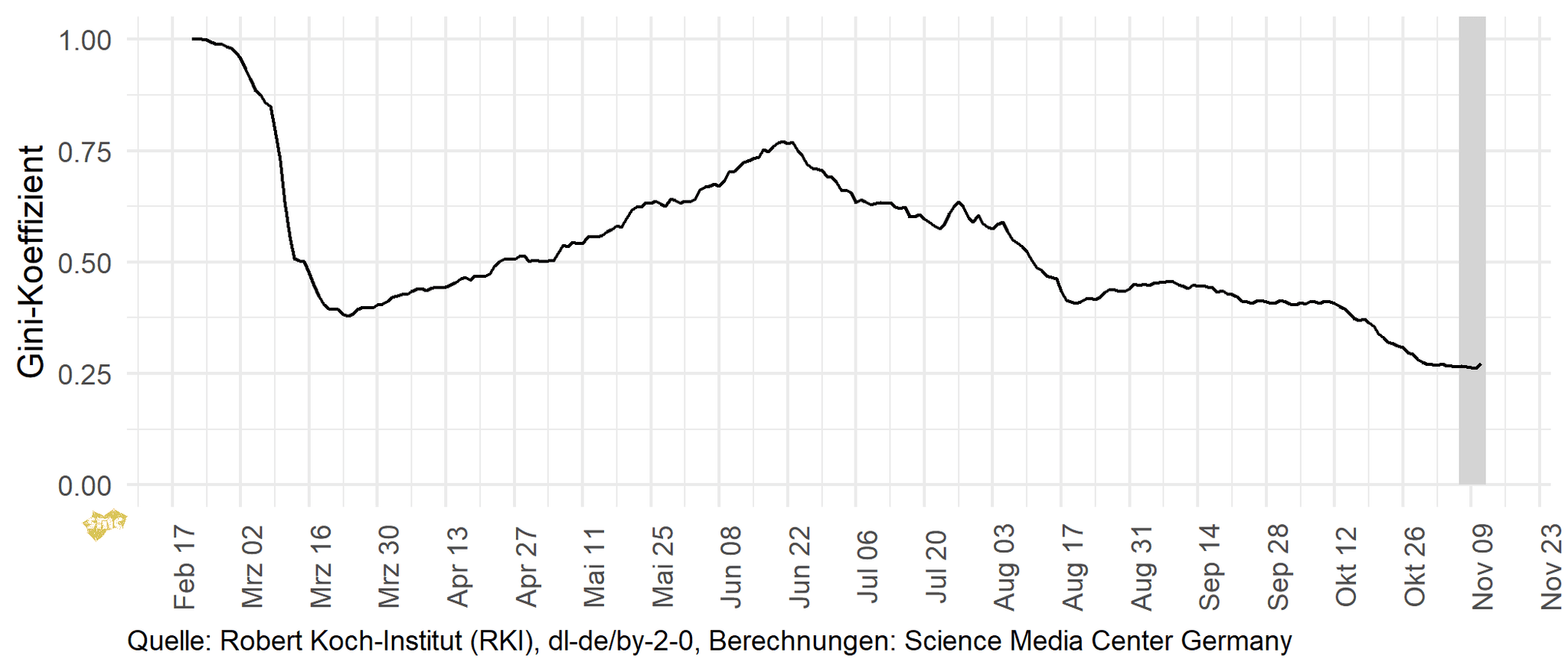 Ende Februar war die Ungleichheit bei den gemeldeten Fällen noch sehr groß, fiel dann aber mit steigender Fallzahl ab, da sich das Virus über Deutschland verteilte. Auch in den Hochzeiten waren die gemeldeten Fälle pro 100 000 Personen nicht gleichmäßig verteilt, der Gini-Koeffizient fiel nie unter 0,35.