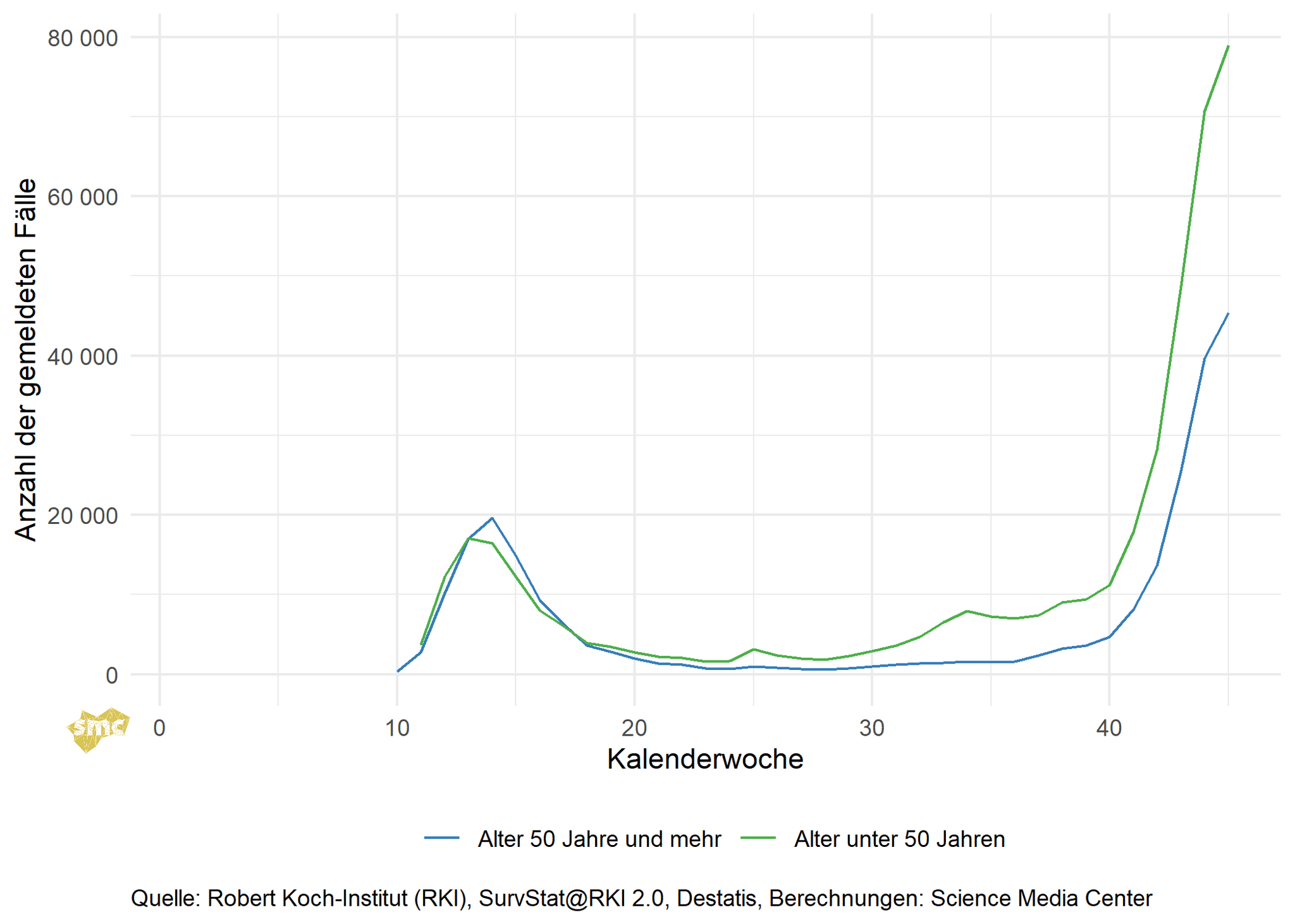 Die Grafik zeigt die gemeldeten Fallzahlen einmal für Personen unter 50 Jahren und einmal ab 50 Jahren. Seit dem Spätsommer ist zu sehen, dass die Fallzahlen in den unteren Altersgruppen zuerst steigen.