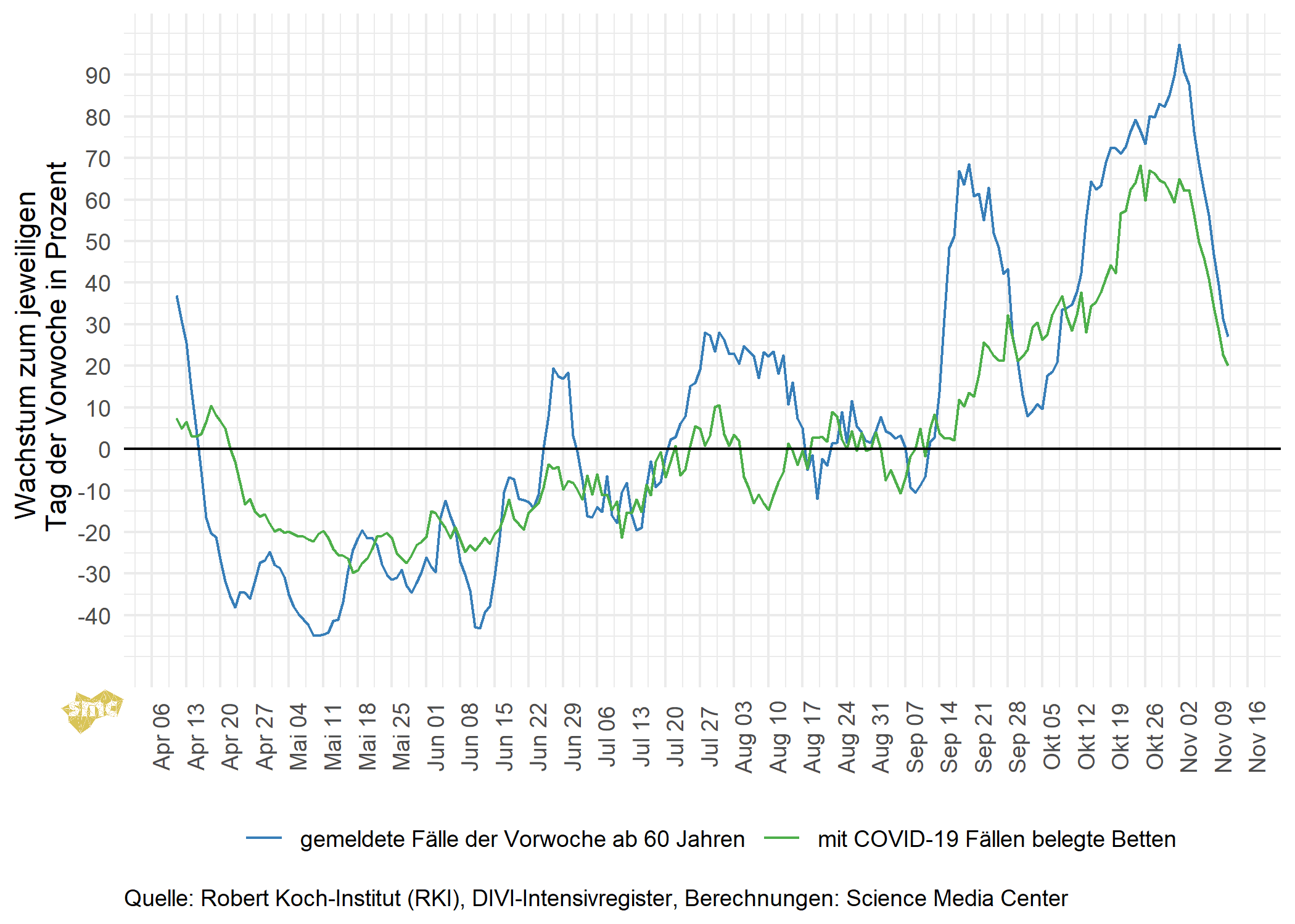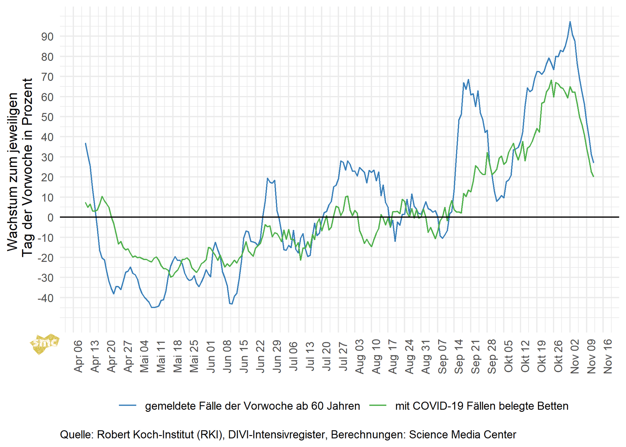Einen besseren Eindruck von der aktuell beschleunigten Dynamik bekommt man – wie immer bei exponentiellem Wachstum –, wenn man auf das prozentuale Wachstum schaut. In der folgenden Grafik ist das prozentuale Wachstum der mit COVID-19-Fällen belegten Intensivbetten im Vergleich zur Vorwoche abgetragen. Zusätzlich ist auch das um eine Woche verschobene Wachstum der gemeldeten Fallzahlen der Altersgruppen ab 60 Jahren dargestellt. Da gemeldete Fälle in der Regel erst nach einigen Tagen intensivmedizinisch behandelt werden müssen, sofern sie diese Behandlung benötigen, sind durch diese Verschiebung die Wachstumsraten besser zu vergleichen.