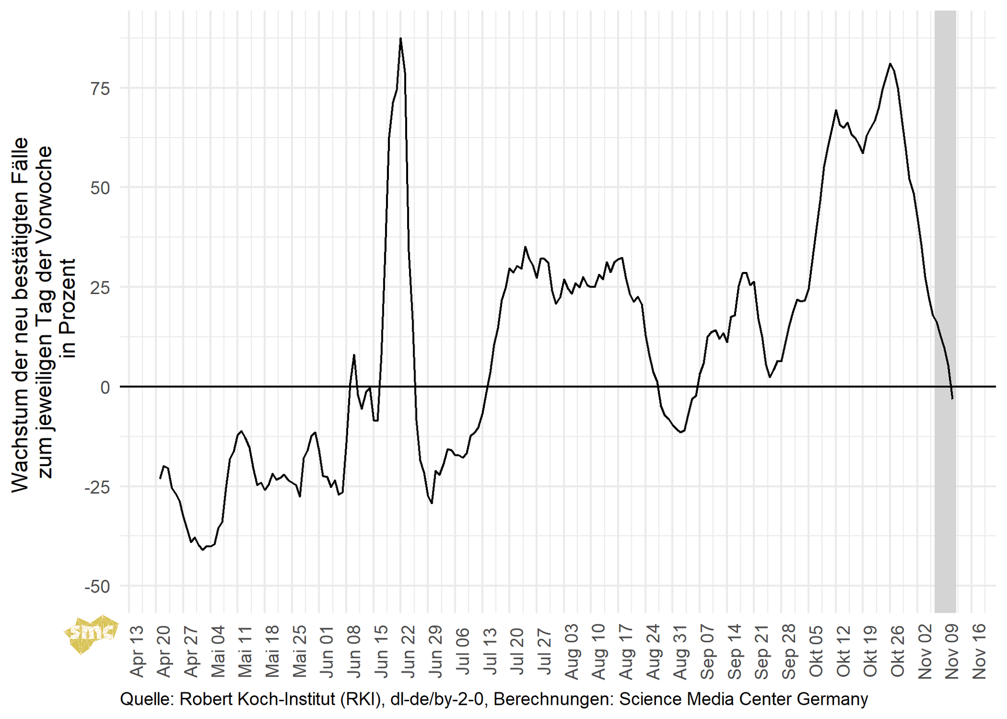Die Grafik zeigt für jeden Tag das Wachstum der geglätteten Fallzahlen im Vergleich zur Vorwoche. Das Wachstum verlangsamt sich zur Zeit stark, ist aber weiterhin positiv. Laut Situationsbericht vom 04.11. liegt der Anteil der positiven PCR-Tests an allen Test inzwischen bei über sieben Prozent. Dies kann bedeuten, dass auf Grund der begrenzten Testkapazitäten zunehmend Fälle nicht getestet und damit übersehen werden. Unter dieser Annahme läge das wirkliche Wachstum der Fallzahlen höher.