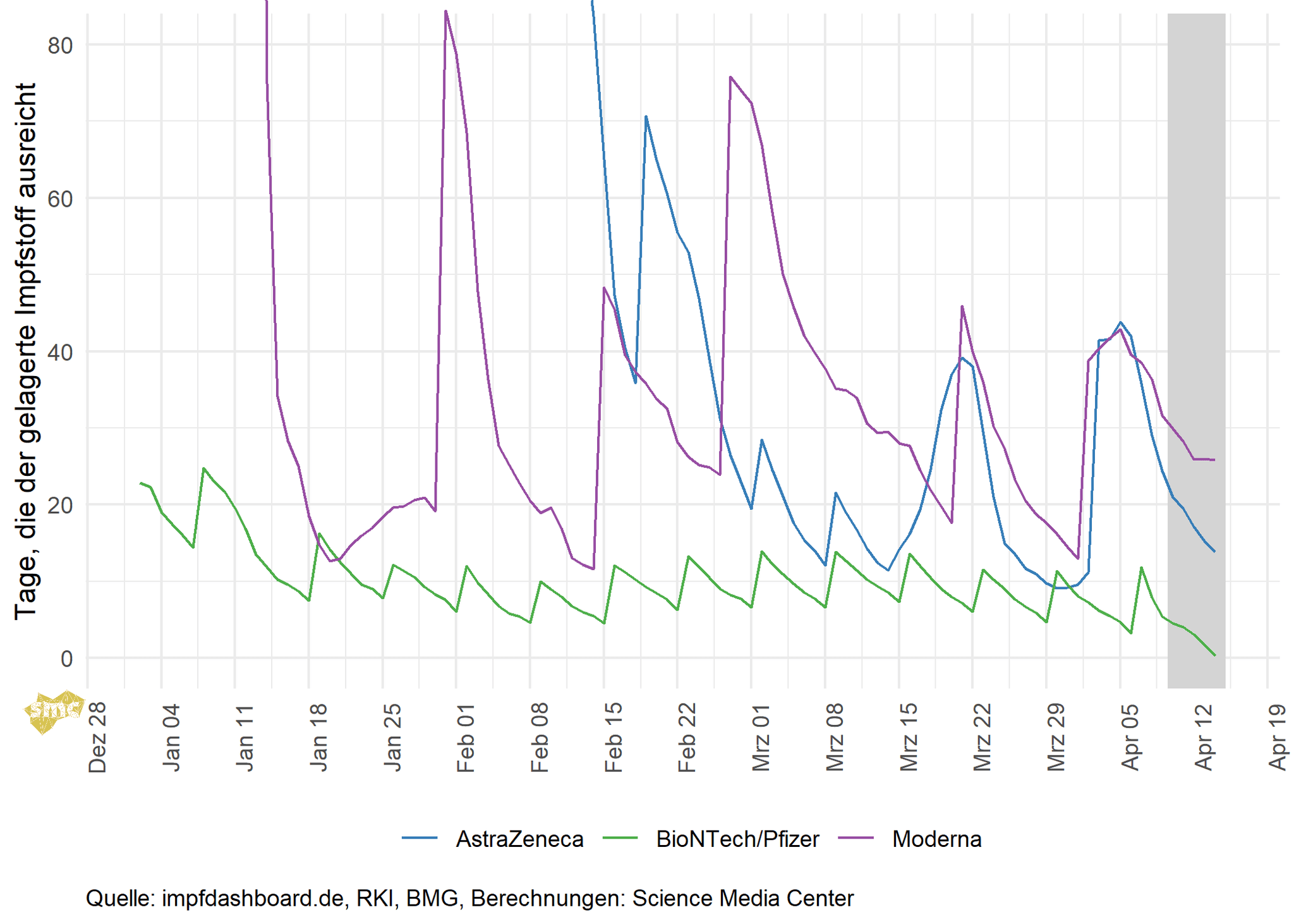 Bei AstraZeneca werden aktuell täglich mehr als 100 000 Dosen verimpft. Da die Lieferungen bis Monatsende eher kleiner ausfallen, wird so der Vorrat weiter abgebaut.