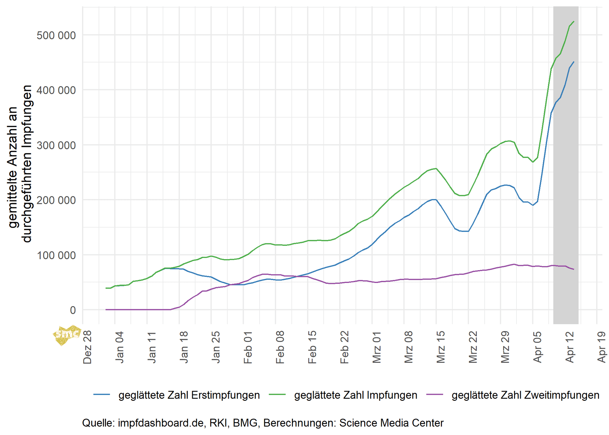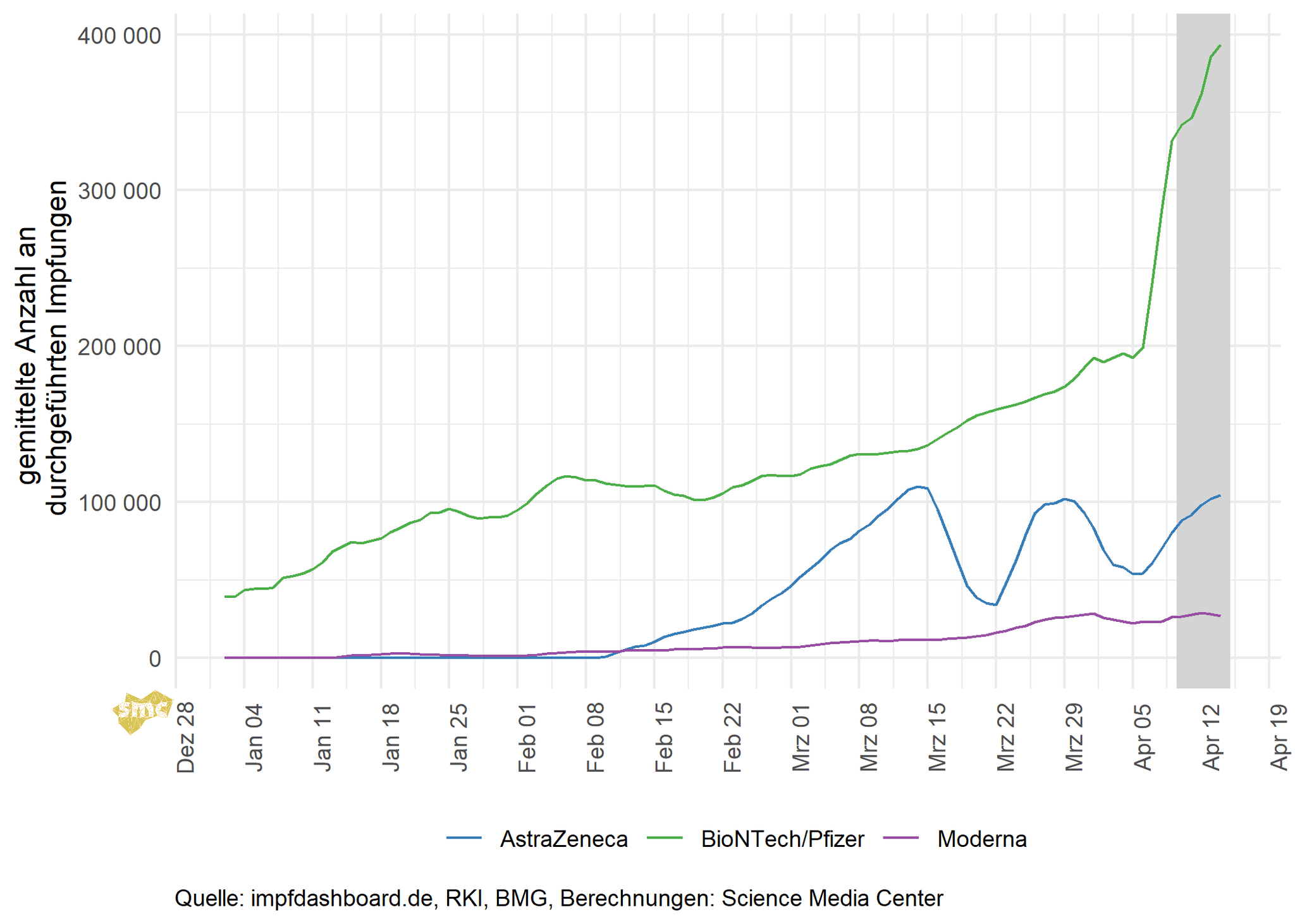 Die aktuelle Diskussion um den Johnson & Johnson-Impfstoff wirft die Impfgeschwindigkeit nicht weiter zurück. Für den gesamten April waren bisher nur 232 800 gelieferte Dosen angekündigt, also weniger als die Hälfte der täglich verimpften Dosen.