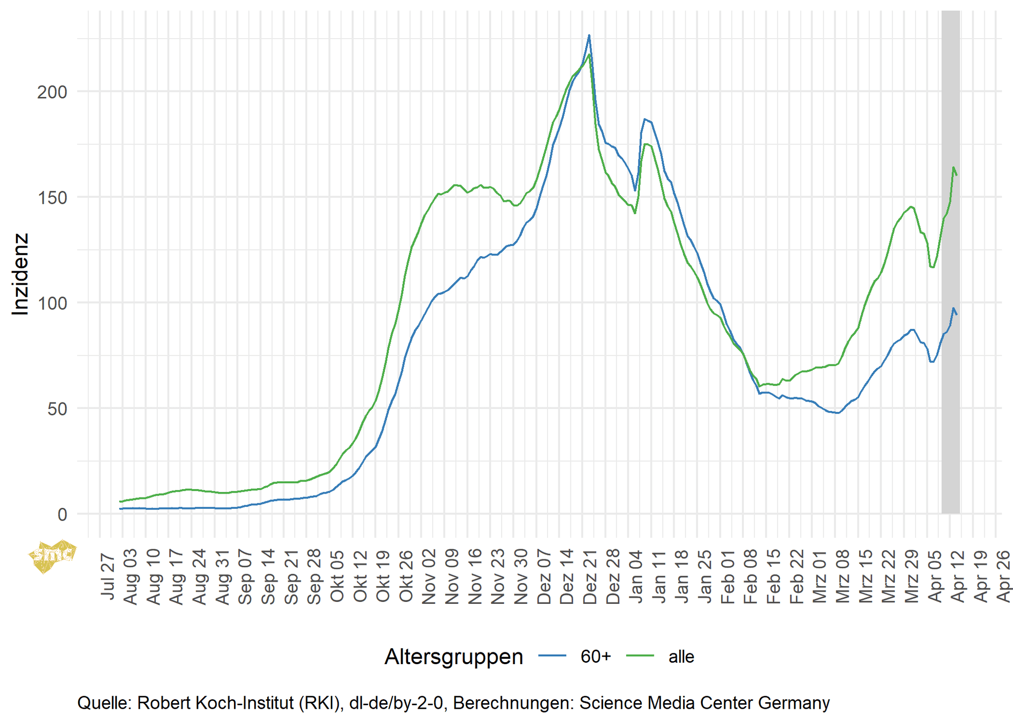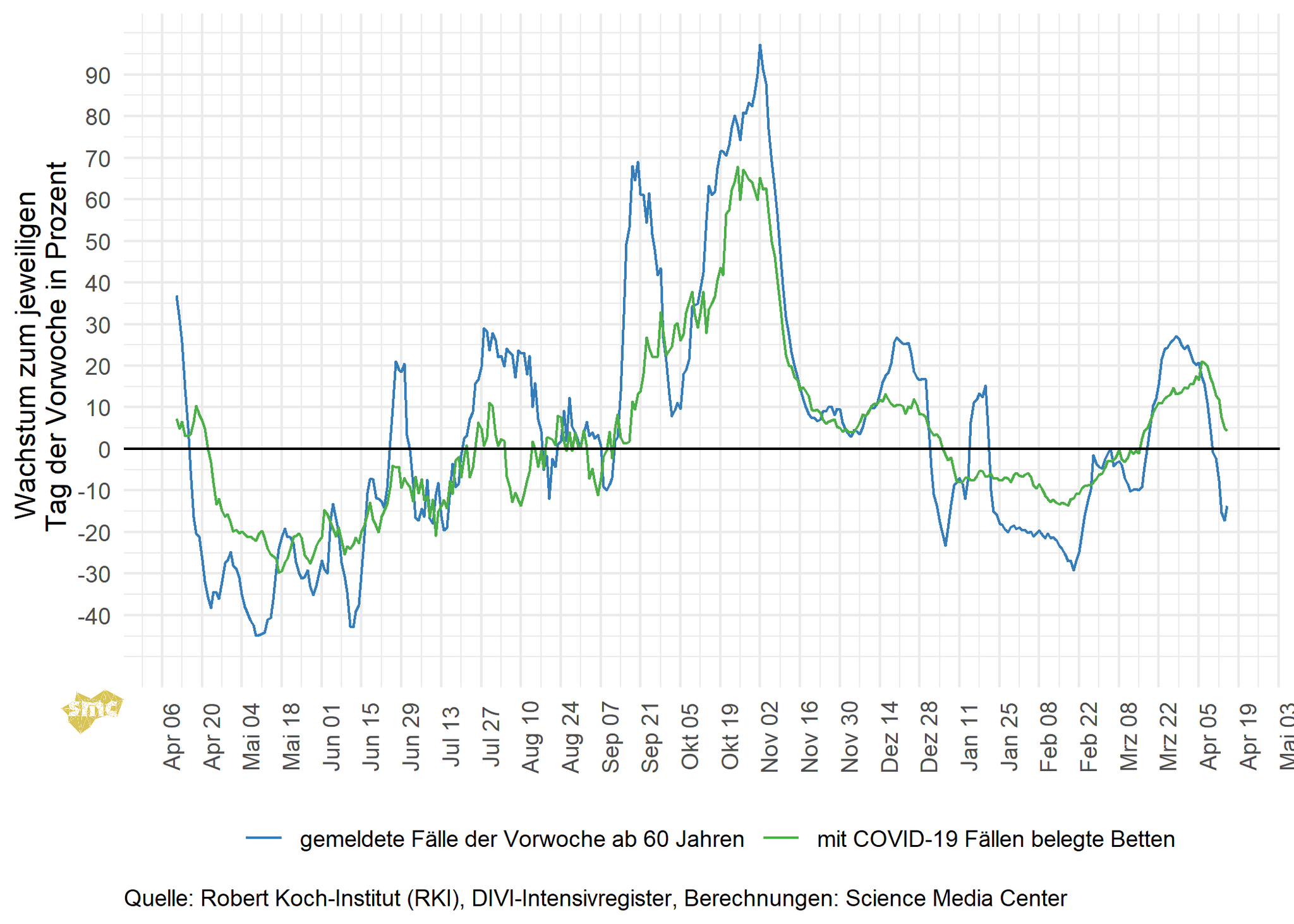 Die Grafik zeigt für jeden Tag das prozentuale Wachstum der geglätteten Fallzahlen im Vergleich zur Vorwoche. Dabei werden einmal alle gemeldeten Fälle berücksichtigt und einmal nur Fälle mit einem Alter von mindestens 60 Jahren. Im Gegensatz zur Höhe der Inzidenz wird das Wachstum noch stark von den geringen Meldezahlen um Ostern beeinflusst. Erst in der kommenden Woche lässt sich das aktuelle Wachstum besser einschätzen. Der Vergleich einzelner Meldedaten mit einem Wert von vor Ostern suggeriert aktuell ein wöchentliches Wachstum um zehn Prozent.