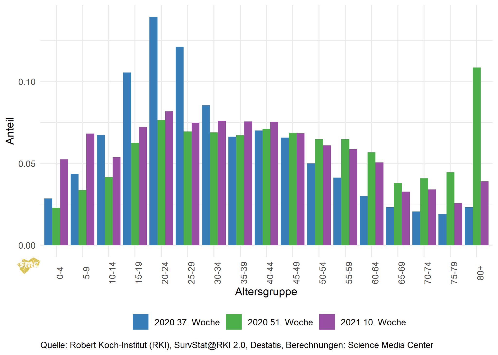 Dass sich die Inzidenzen auch durch die Impfungen anders entwickeln als die Fälle auf den Intensivstationen, wird zur Zeit stark diskutiert. Betrachtet man die Altersverteilung verschiedener Kalenderwochen, kann man diesen Unterschied gut nachvollziehen. Anfang September 2020 (KW 37) traten besonders viele gemeldete Fälle in den Altersklasse zwischen 15 und 30 Jahren auf. Der Anteil der hohen Altersklassen war niedriger. Kurz vor Weihnachten (KW 51) waren die über 80-Jährigen besonders stark betroffen. Mit der Verbreitung der B.1.1.7-Variante ist der Anteil in den Altersgruppen in der 10. Kalenderwoche deutlich gleichmäßiger als im Herbst 2020. Der Anteil der über 80-Jährigen ging seitdem sogar noch zurück. Da die Altersklassen unterschiedlich stark besetzt sind, ist der absolute Vergleich verschiedener Altersklassen in dieser Darstellung nicht sinnvoll.