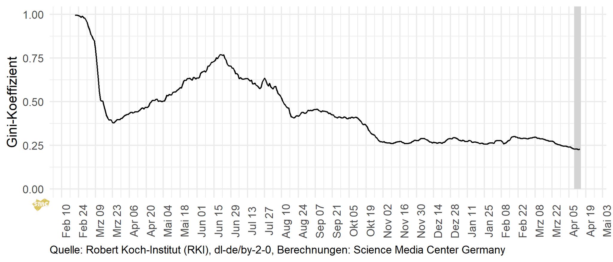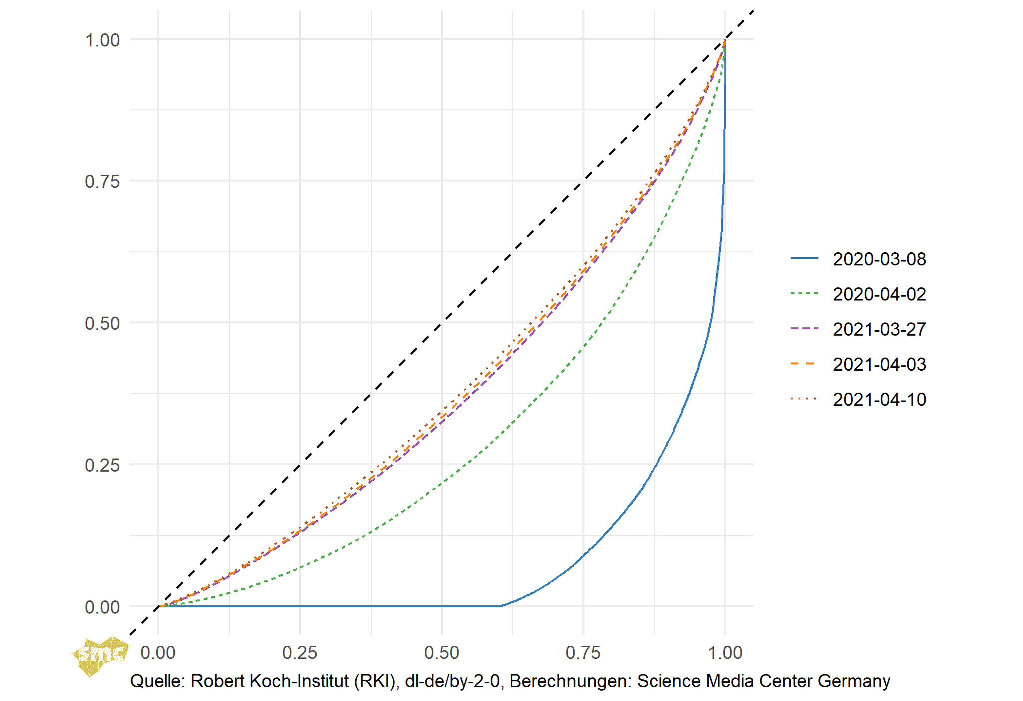 Ende Februar war die Ungleichheit bei den gemeldeten Fällen noch sehr groß, fiel dann aber mit steigender Fallzahl ab, da sich das Virus über Deutschland verteilte. Auch in den Hochzeiten waren die gemeldeten Inzidenzen nicht gleichmäßig verteilt.
