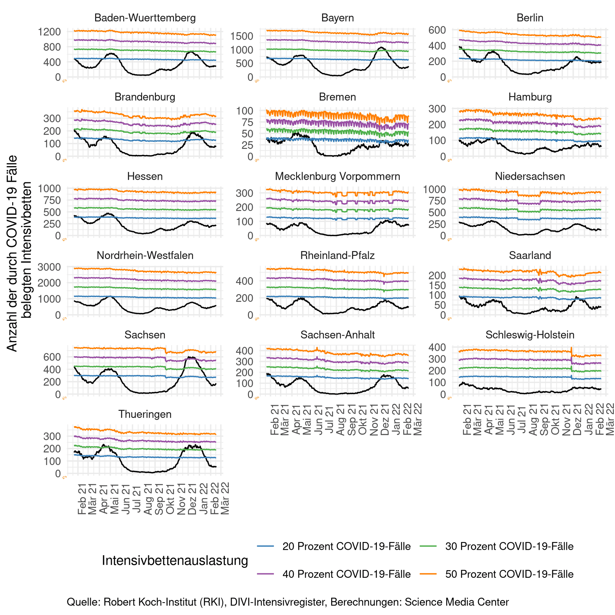 Schaut man sich nach Bundesländern an, wie die Intensivstationen ausgelastet sind, lag im vergangenen Winter das jeweilige Maximum auf einem anderen relativen Niveau. Während Berlin und Sachsen in der Spitze eine Auslastung von etwa 40 Prozent erreichten, waren in Schleswig-Holstein nicht einmal 20 Prozent der gemeldeten Intensivbetten mit COVID-19-Fällen belegt. Die relative Grenze schwankt dabei über die Zeit, da nicht an jedem Tag gleich viele verfügbare Betten gemeldet werden. Um die relative Belastung vergleichen zu können, werden auf der Y-Achse unterschiedliche absolute Skalen verwendet. Kein Bundesland verzeichnet mehr eine durch COVID-19-Fälle verursachte Auslastung der Intensivbetten von über 20 Prozent.