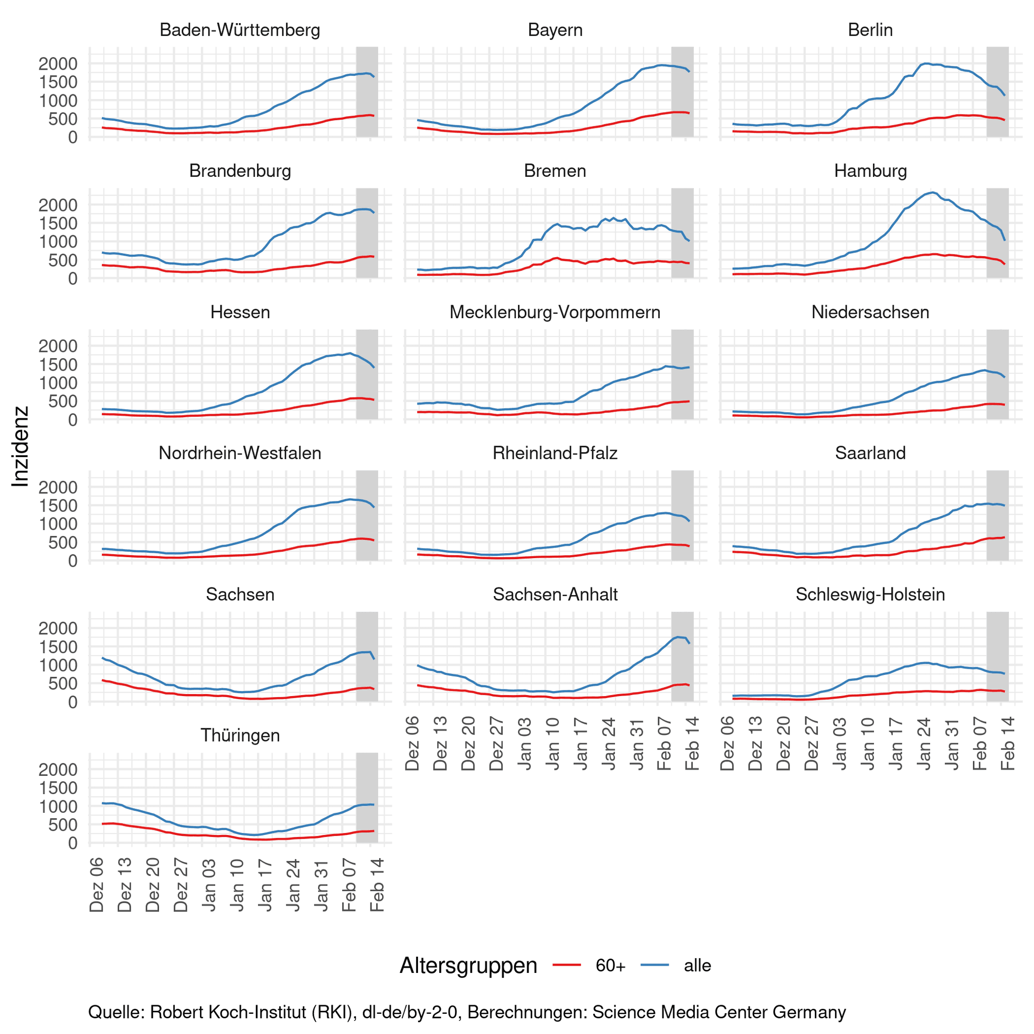 Die Meldeinzidenzen in Deutschland haben am 09.02. ihren bisher höchsten Wert erreicht. Aktuell sinkt die gemeldete Inzidenz leicht. Die Entwicklung ist aber nicht überall gleich, in einigen ostdeutschen Bundesländern steigen sie auch noch deutlich. Auch in den oberen Altersgruppen steigt die Inzidenz noch, aber das Wachstum verlangsamt sich auch hier. Dass der Rückgang der Inzidenz real ist und nicht auf geändertes Testverhalten zurückzuführen ist, lässt sich aus dem aktuellen Bericht des ALM e.V. plausibilisieren. Neben der Zahl der durchgeführten Tests ist auch die Testpositivrate leicht auf 43,9 Prozent zurückgegangen. Der Rückgang der Inzidenz bei den Schulkindern geht laut ARS-Bericht ebenfalls mit einer leicht gesunkenen Testpositivrate einher. Da der Rückgang der Inzidenz aktuell noch sehr langsam ist, können Effekte durch die Virusvariante BA.2 oder ein schnelles verändertes Kontaktverhalten in der Bevölkerung, zum Beispiel durch zu starke kurzfristige Lockerungen, diesen Trend verlangsamen oder kurzfristig umkehren. Betrachtet man den Teil der Bevölkerung, der in den vergangenen 12 Wochen mit dem Virus in Kontakt kam, ist eine qualitativ relevante Trendwende ohne Immunflucht in den unteren Altersgruppen kurzfristig nicht plausibel. Der aktuelle Rückgang wird durch die geänderte Teststrategie allerdings eher etwas überschätzt.