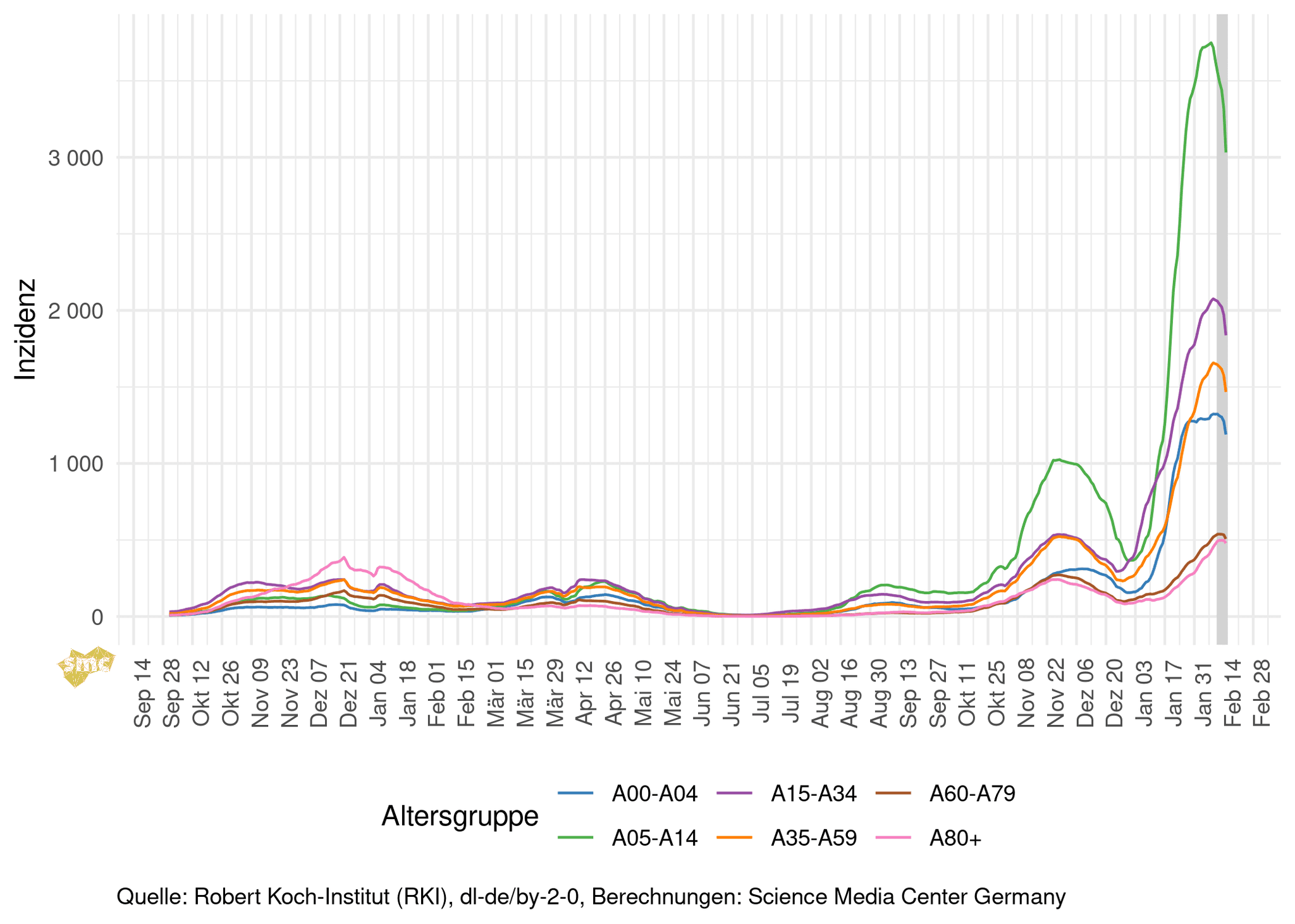 Die Grafik zeigt die Inzidenzen in den Altersgruppen nach Kalenderwoche.