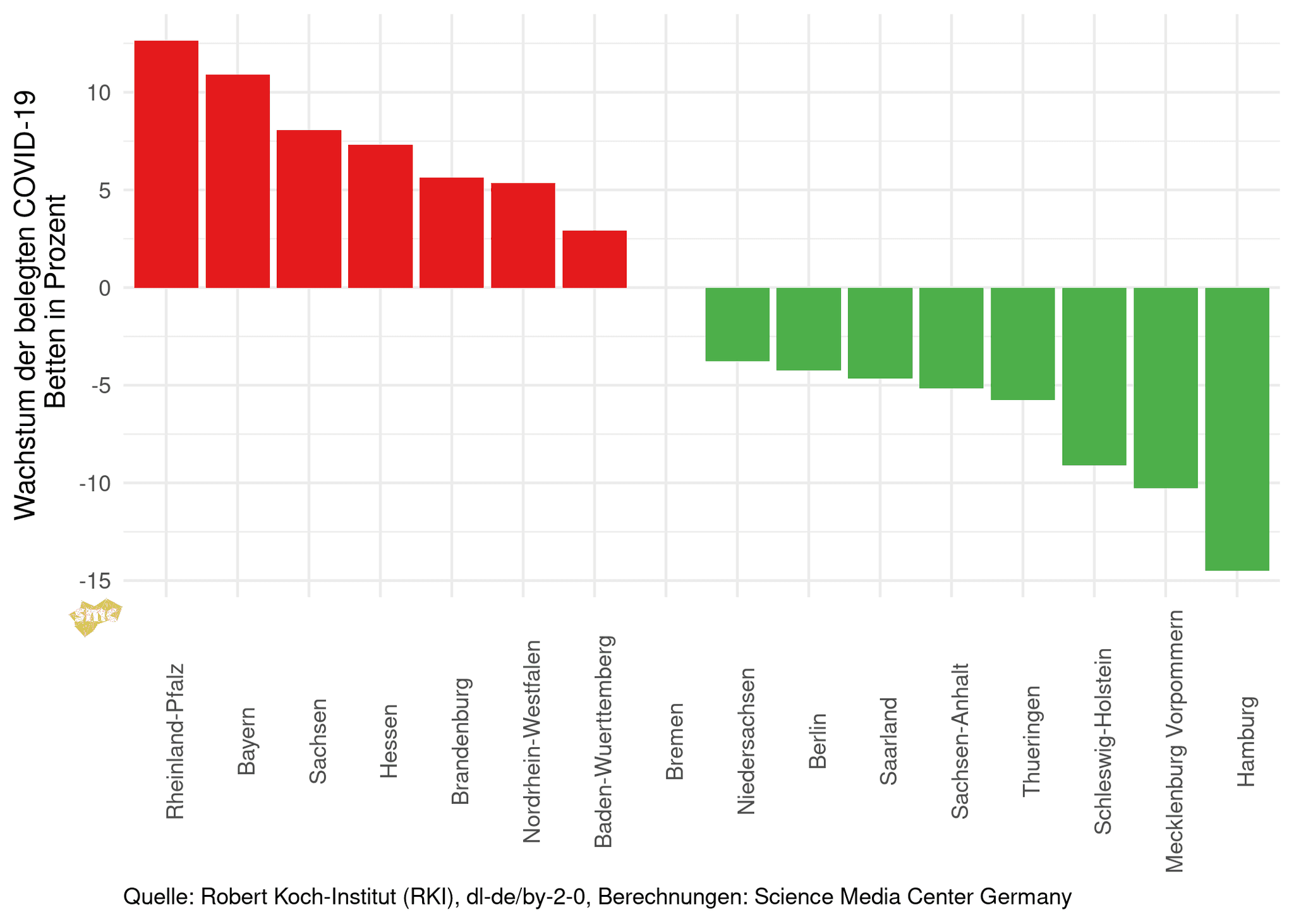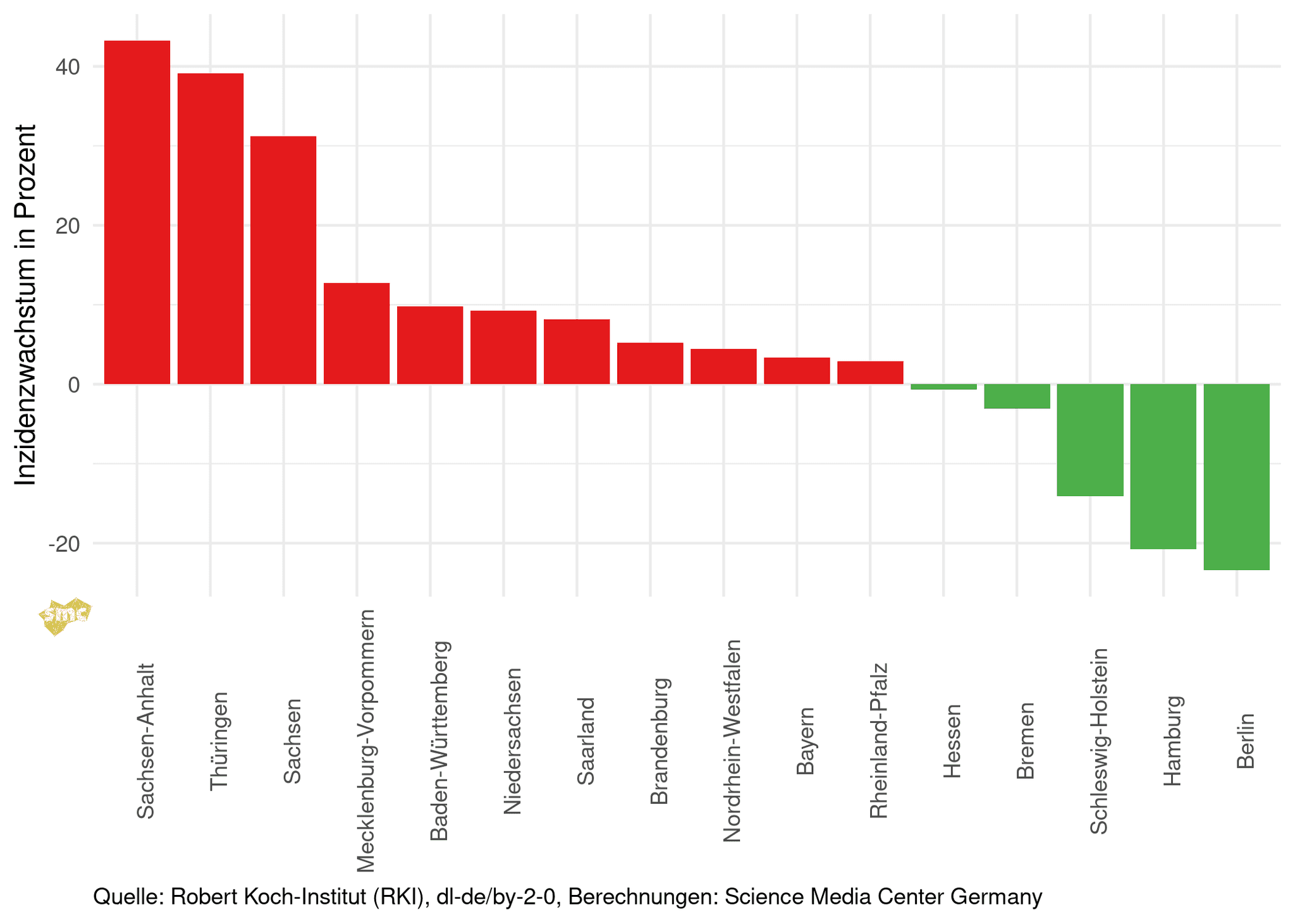Im Folgenden wird das Wachstum der Inzidenz vom 11.02.2022 im Vergleich zur Vorwoche betrachtet. Thüringen, Sachsen und Sachsen-Anhalt weisen noch hohes Wachstum aus, in den anderen Bundesländern geht die Inzidenz zurück oder das Wachstum fällt nur noch gering aus.