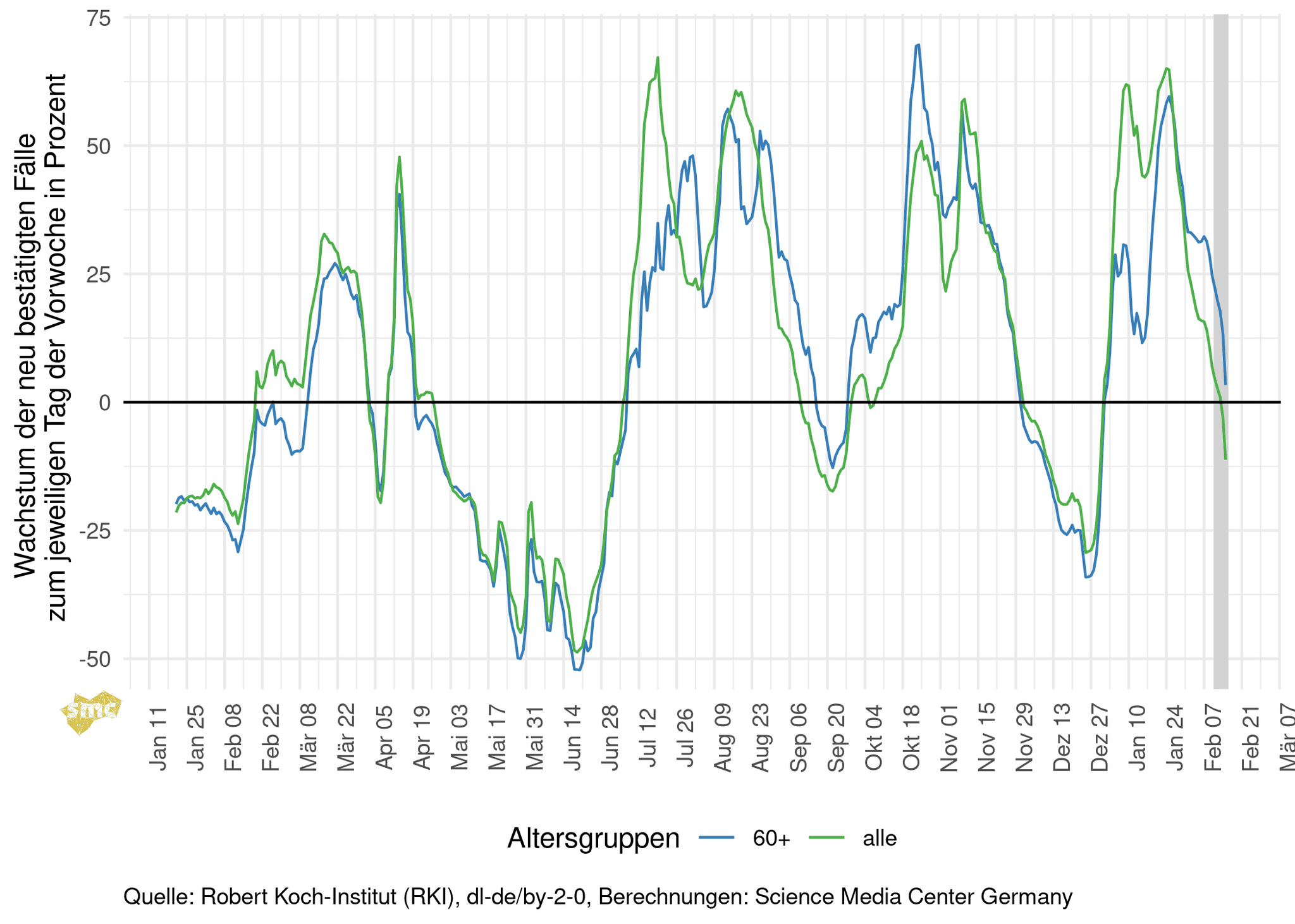 Die Grafik zeigt für jeden Tag das prozentuale Wachstum der geglätteten Fallzahlen im Vergleich zur Vorwoche. Dabei werden einmal alle gemeldeten Fälle berücksichtigt und einmal nur Fälle mit einem Alter von mindestens 60 Jahren. Das Wachstum in der Altersgruppe ab 60 Jahren ist inzwischen deutlich höher als im Bevölkerungsschnitt. Aber auch dort sinkt das Wachstum.