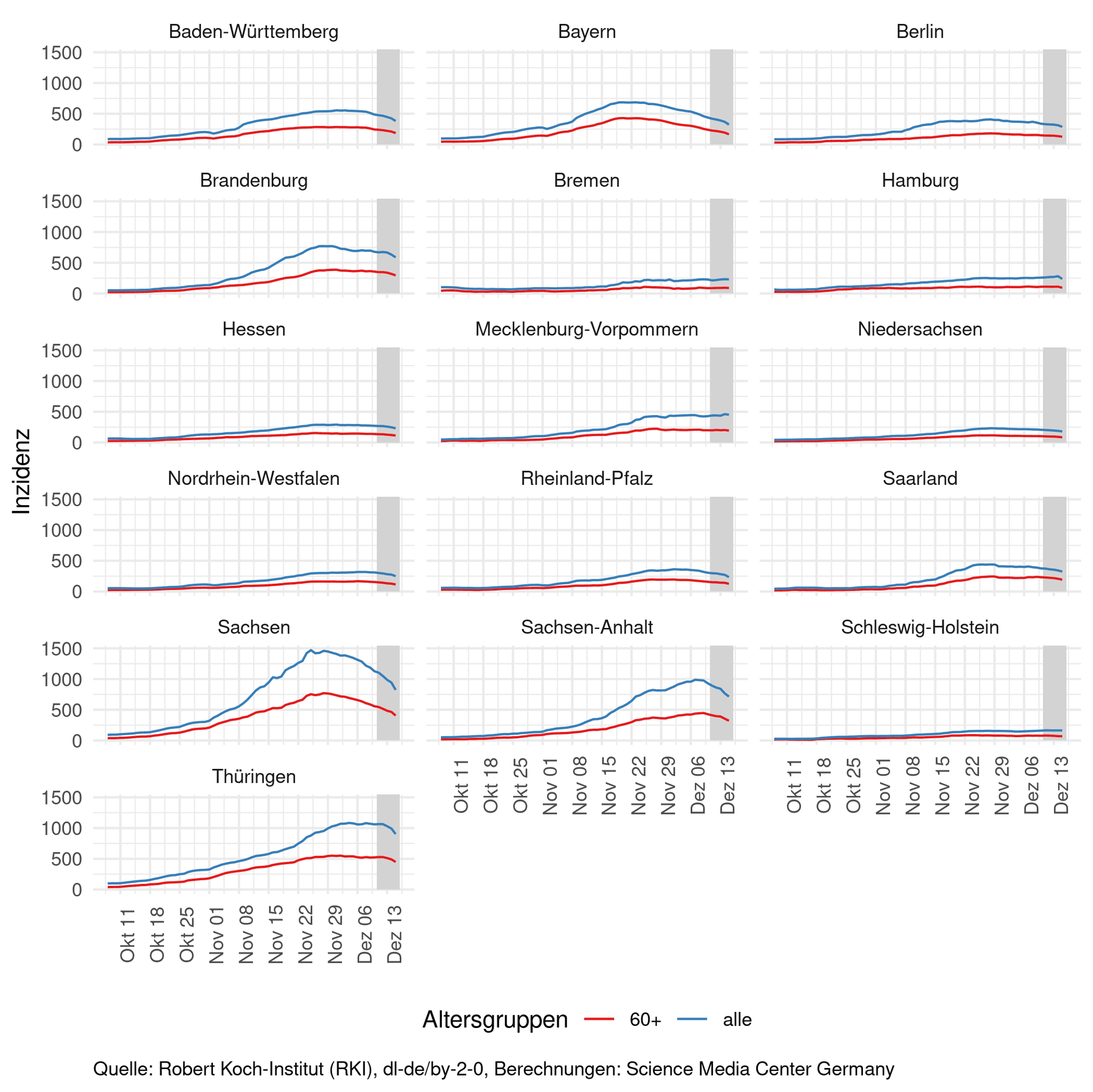 Die folgenden beiden Tabellen enthalten vier verschiedene Maßzahlen. Für den 13.12.2021 werden jeweils die für sieben Tage geglätteten Fallzahlen pro Tag und die Inzidenz angegeben. Darüber hinaus wird jeweils die Differenz der Maßzahl zu dem Wert vom 6.12.2021 angegeben, um eine Veränderung zur Vorwoche zu betrachten.